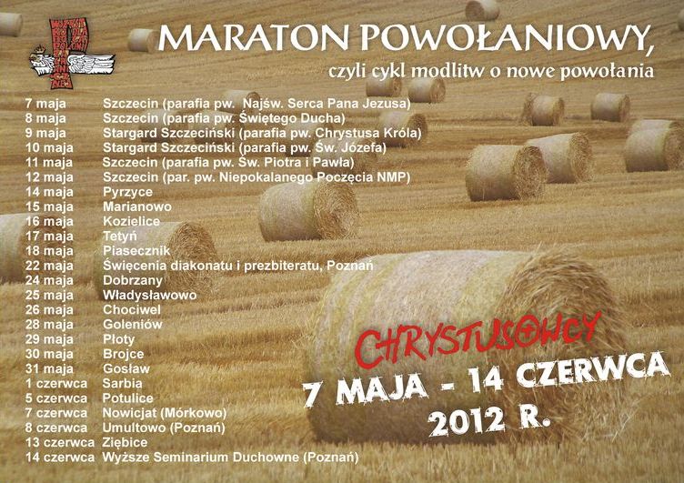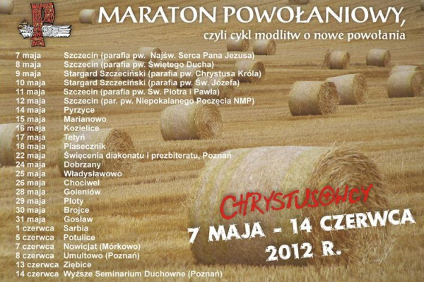 Po raz kolejny na polskich (i nie tylko) placówkach Towarzystwa Chrystusowego rozpoczyna się tzw. „Maraton Powołaniowy” jako swoistego rodzaju przedłużenie kwartalnych dni modlitw o powołania do służby Bożej w Kościele. Jest to inicjatywa zintensyfikowanej modlitwy o nowe powołania kapłańskie i zakonne szczególnie do naszej wspólnoty zakonnej. Począwszy do 7 maja każdego dnia w innej parafii rozbrzmiewać będzie wołanie: Panie daj nam nowych kapłanów, braci zakonnych”. Modlitwie towarzyszyć będą katechezy na temat powołania, spotkania z młodzieżą i inne inicjatywy. Maraton zakończy się 14 czerwca w naszym Wyższym Seminarium Duchownym w Poznaniu.
