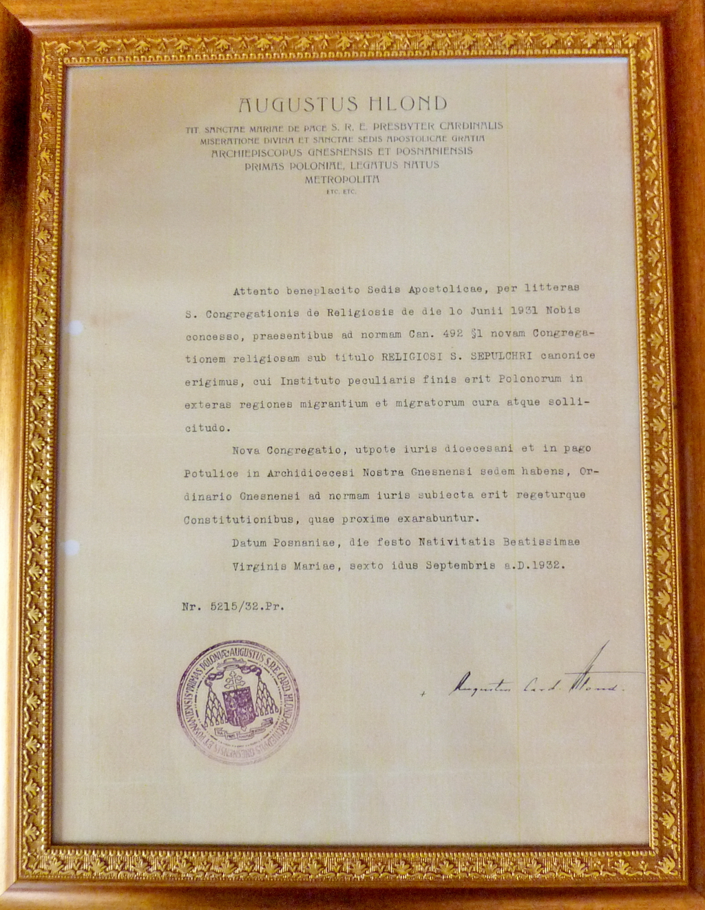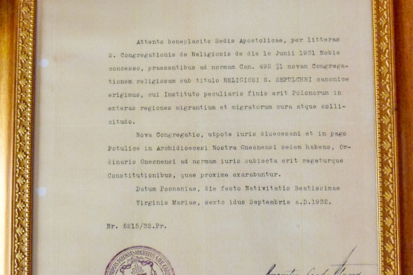 Po uzyskaniu zgody Stolicy Apostolskiej, pismem Świętej Kongregacji dla Spraw Zakonnych z dnia 10 VI 1931 roku obecnym pismem zgodnie z kan. 492 §1 erygujemy kanonicznie nowe zgromadzenie zakonne pod nazwą Zgromadzenie Świętego Grobu, którego celem specjalnym jest troska i staranie o Polaków, którzy wyemigrowali i emigrują.