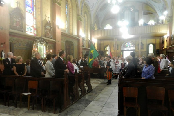 Eucharystię rozpoczynamy procesją do ołtarza z flagami Polski i Brazylii. Młodzież polonijna, z zespołu folkloru „Wisła”, odświętnie ubrana w kolorowe, polskie stroje ludowe, z dostojeństwem niesie w procesji nasze, szczególnie kochane i szanowane, symbole narodowe. Przed obrazem Królowej Polski i Polonii – Tej, która ze wzgórza jasnogórskiego króluje swoim dzieciom w kraju i rozsianym po świecie – młodzi z szacunkiem i miłością pochylają swoje głowy wraz z naszymi narodowymi sztandarami. Chór Jana Pawła II towarzyszy naszej procesji śpiewem pieśni, która wznosi nasze serca i ducha do Pana Wieków w szczerej i głębokiej podzięce za wolną, niepodległą Ojczyznę! Flagi naszych zaprzyjaźnionych krajów młodzi ustawiają z boku ołtarza. Chór rozpoczyna śpiew naszego hymnu narodowego, do którego włączają się gromkim głosem i rozradowanym sercem obecni w świątyni Polacy i potomkowie naszych dzielnych osadników. Po odśpiewaniu naszego hymnu, chór intonuje rytmiczny i melodyjny hymn Brazylii. W jego śpiew włączają się nasi przyjaciele Brazylijczycy, wraz z licznie obecną wspólnotą polonijną. Wzruszający i wymowny moment, kiedy my Polacy i potomkowie Piasta od pokoleń mieszkający w Kurytybie z radosnym i wzruszonym sercem śpiewamy dwa hymny narodowe. Dla mnie – polskiego imigranta z wyboru woli i pragnienia serca – jest to wymowny i bardzo przemawiający znak. Śpiewając hymn Polski i Brazylii wyrażamy miłość do dwóch Ojczyzn: Polski i Brazylii. Dla jednych ta pierwsza to, z urodzenia, ukształtowania duchowego i patriotycznego, wychowania i przez jakiś okres przebywania we wspólnocie narodowej, tam nad Wisłą. Dla drugich, tu mam na myśli osoby polskiego pochodzenia urodzone w Brazylii - w tym jakżeż gościnnym kraju, wypróbowanym w szczerej i historycznej do nas przyjaźni - śpiew polskiego hymnu z pewnością odnawiał i pogłębiał w ich sercach to, co najbardziej szlachetne, a co przekazali im w specyficznym testamencie ich rodzice. Śpiew hymnu brazylijskiego dla obywateli tego kraju to, z pewnością uzewnętrznienie ich patriotyzmu i miłości do kraju, który nie doznał tylu doświadczeń dziejowych, co nasz kraj. Dla potomków Piasta tu urodzonych, śpiew hymnu tego kraju to, również przejaw ich miłości do niego i więzi z wszystkimi jego obywatelami, którzy poprzez swoje pochodzenie etniczne reprezentują tutaj właściwie wszystkie narody świata… Dla nas Polaków urodzonych w Kraju nad Wisłą, żyjących i pracujących w Brazylii, śpiew hymnu tego kraju również uzewnętrznia jakiś charakterystyczny i zarazem symboliczny znak naszej integracji z tą bogatą, piękną ziemią, jak również jej serdecznymi mieszkańcami.