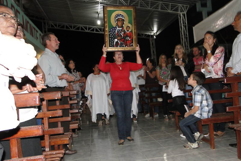 Procesyjnie z obrazem i relikwiami udaliśmy się do centrum duszpasterskiego, gdzie sprawowana była uroczysta Msza św. Trzeba wyrazić wielkie uznanie dla liderów wspólnoty, którzy bardzo starannie przygotowali liturgię Mszy oraz zaangażowanie wiernych w uczestnictwie we wspomnianej celebracji Eucharystii. W ich śpiewie pieśni, w modlitwach można było odczuć głęboką i na zewnątrz wyrażaną wiarę! Po proklamacji Ewangelii, w mojej refleksji, starałem się przybliżyć zebranym setkom wiernych nie tylko szkic historii obrazu Pani Jasnogórskiej, ale nade wszystko rolę Maryi, w życiu naszego Narodu. Nie mogłem nie wspomnieć o wielkiej czci i miłości bł. Jana Pawła II do Matki Jezusa i Matki naszego polskiego narodu! Pod koniec Mszy św. kilka dziewcząt – w imieniu zebranej i skupionej wspólnoty – wyraziło cześć do Pani Jasnogórskiej, patronki ich regionu. Dowiedziałem się później, podczas rozmów z miejscowymi liderami, że biskup diecezji Colatina, do której należy parafia Sao Domingos do Norte, postanowił, że Pani Jasnogórska będzie współpatronką miejscowego kościoła filialnego mającego do tej pory za patrona św. Błażeja. Wspomniana parafia podzielona jest na tzw. sektory. Do każdego z nich należą wierni kilku kościołów filialnych. Właśnie Pani Jasnogórska ogłoszona została Patronką jednego z takich sektorów. Stąd też, kiedy pod koniec Mszy św. powiedziałem do zebranych wiernych, że od tej chwili ikona Matki Bożej - przywieziona z Polski jest prezentem Polskiej Misji Katolickiej – i należy do nich, rozległy się długo trwające oklaski; wyraz ich radości! Później podeszli do obrazu przedstawiciele wspólnot należących do wspomnianego sektora, aby poprzez bliskość z ikoną wyrazić miłość i cześć do swojej Patronki, Pani Jasnogórskiej! Po błogosławieństwie kończącym bardzo emocjonalnie przeżywaną Eucharystię wierni podchodzili do obrazu i relikwii, aby się modlić.