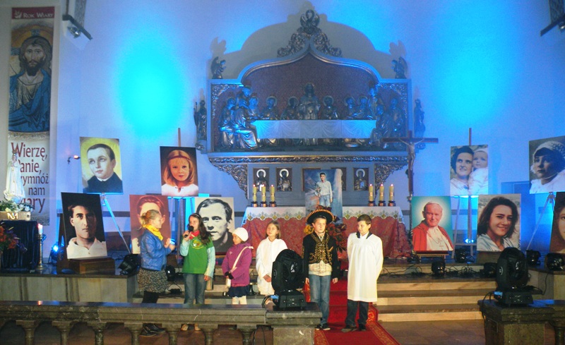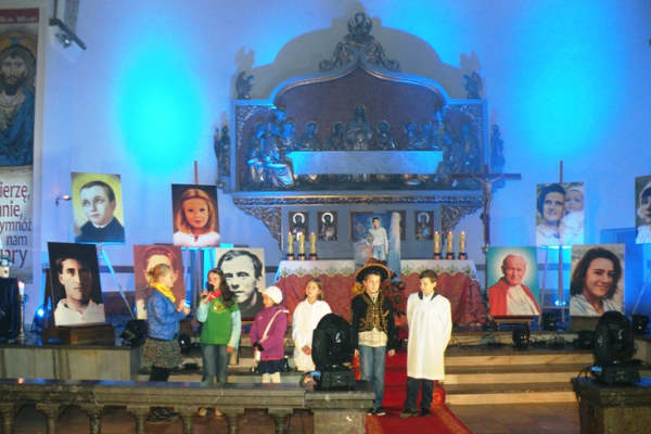 Czuwanie modlitewne rozpoczęło się o godz. 18.30 Mszą Świętą „bez prądu” – czyli przy świetle płonących świec. Procesję do ołtarza, podczas której śpiewno litanię do wszystkich świętych, poprowadziły dzieci – przebrane za anioły i swoich świętych patronów – z lampionami w rękach. Druga część spotkania rozpoczęła się bezpośrednio po Mszy „drogą światła”, podczas której młodzież przygotowująca się do przyjęcia sakramentu bierzmowania wnosiła portrety świętych i błogosławionych. Dzieci z Ogniska Misyjnego wykonały scenkę, w której przedstawiły postaci bliskich sobie dziecięcych świętych, po czym nastąpiła prezentacja życiorysów – Sług Bożych: niespełna 7-letniej Antonietty Meo oraz francuskiej 11-latki Anny de Guigne, następnie bł. męczennika z Meksyku Jose Sacheza del Rio oraz patrona dzieci i młodzieży św. Stanisława Kostki a także św. matki Joanny Beretty Moli. Każdej prezentacji towarzyszyły modlitwa i śpiewy. To wszystko miało na nowo uświadomić obecnym, że świętość nie jest zarezerwowana tylko dla niektórych, jest przeznaczona dla każdego.