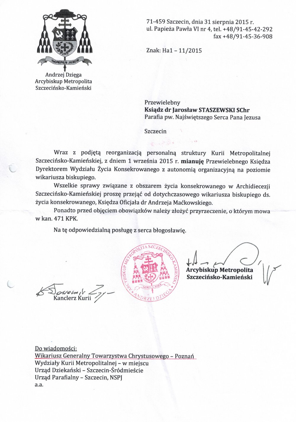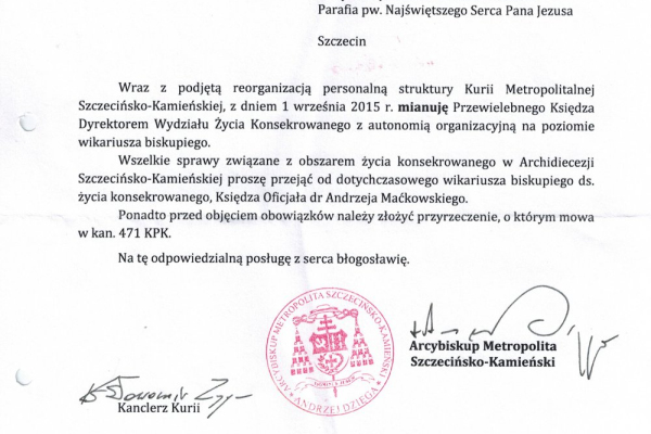 Metropolita Szczecińsko-Kamieński, abp. Andrzej Dzięga, mianował ks. dra Jarosława Staszewskiego TChr Dyrektorem Wydziału Życia Konsekrowanego z autonomią organizacyjną na poziomie wikariusza biskupiego.