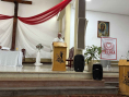Po modlitwie w kościele udaliśmy się do dużej sali parafialnej usytuowanej poniżej wzgórza, na którym przed ponad 50 laty postawiono imponującą świątynię, w której zanieśliśmy wspólne dziękczynienie i znajdziemy wiele polskich elementami. Parafialna sala to też dzieło miejscowych parafian i ich wieloletnich duszpasterzy – chrystusowców (posługujących w tej parafii do 2013 r.) Niestety zmniejsza się liczba duszpasterzy polonijnych w Brazylii, a potrzeba ich posługi nadal jest wyrażana przez tamtejszą Polonię… Co będzie dalej…? Bowiem żniwo wciąż wielkie wśród Polonii w Brazylii, a pasterzy coraz mniej…