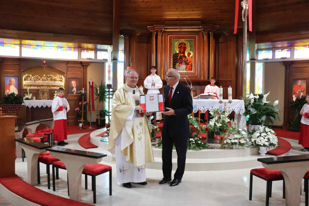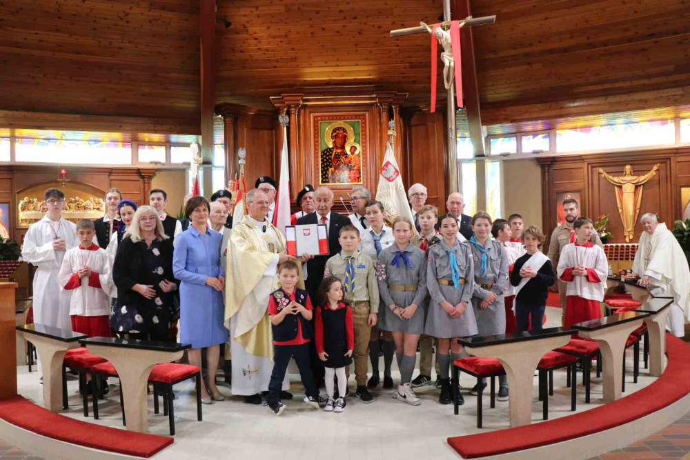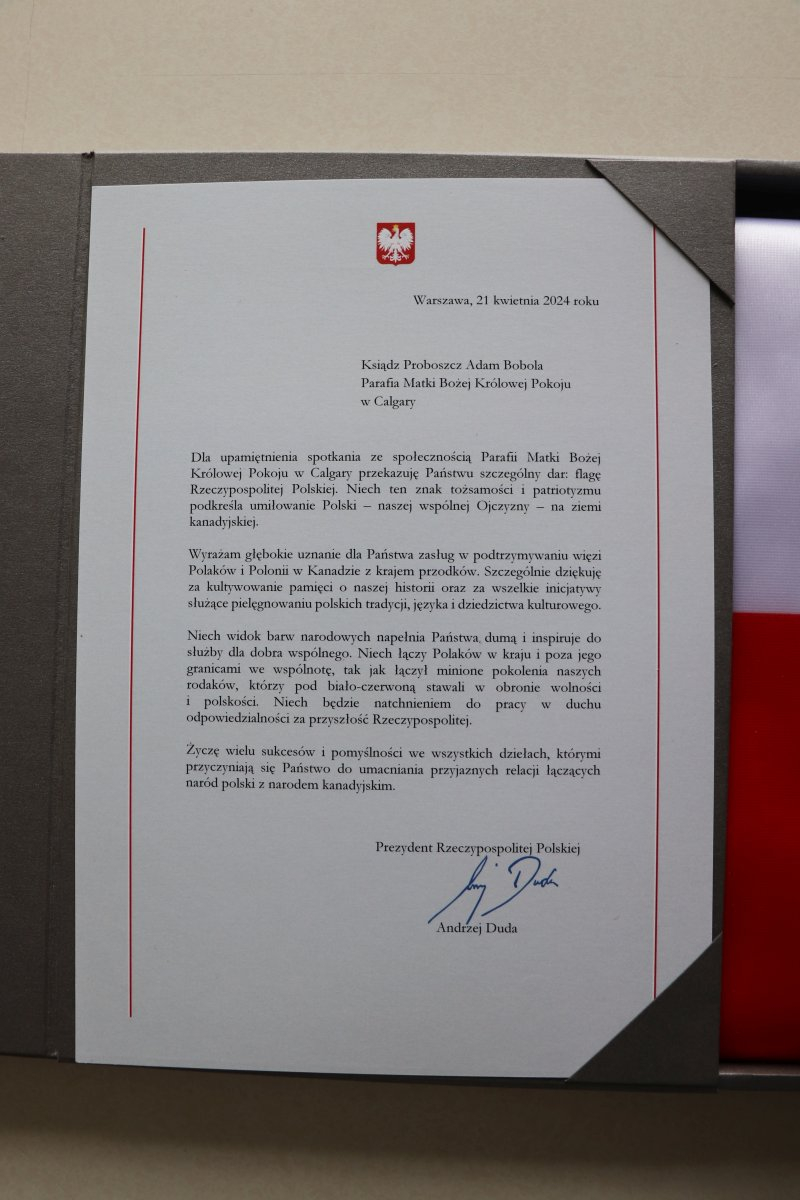 W czasie kwietniowej wizyty Prezydenta RP Pana Andrzeja Dudy w USA i Kanadzie odbyło się kilka spotkań Pary Prezydenckiej z Polonią, podczas jednego z nich, w Edmonton 21 kwietnia 2024 r., parafia Matki Bożej Królowej Pokoju w Calgary była jedną z uhonorowanych otrzymaniem z rąk Prezydenta RP Flagi Rzeczypospolitej Polskiej. W imieniu parafii odebrał ją Konsul Honorowy RP w Calgary pan Zygmunt Potocki. Natomiast ceremonia jej oficjalnego przekazania w parafii odbyła się w niedzielę 5 maja 2024 r., w czasie parafialnego świętowania majowych świąt Dnia Polonii i Dnia Flagi oraz Święta Konstytucji 3 Maja i uroczystości NMP Królowej Polski. Po uroczystej Mszy Świętej w intencji Ojczyzny Pan Konsul przekazał Flagę ks. Proboszczowi Adamowi Boboli SChr.