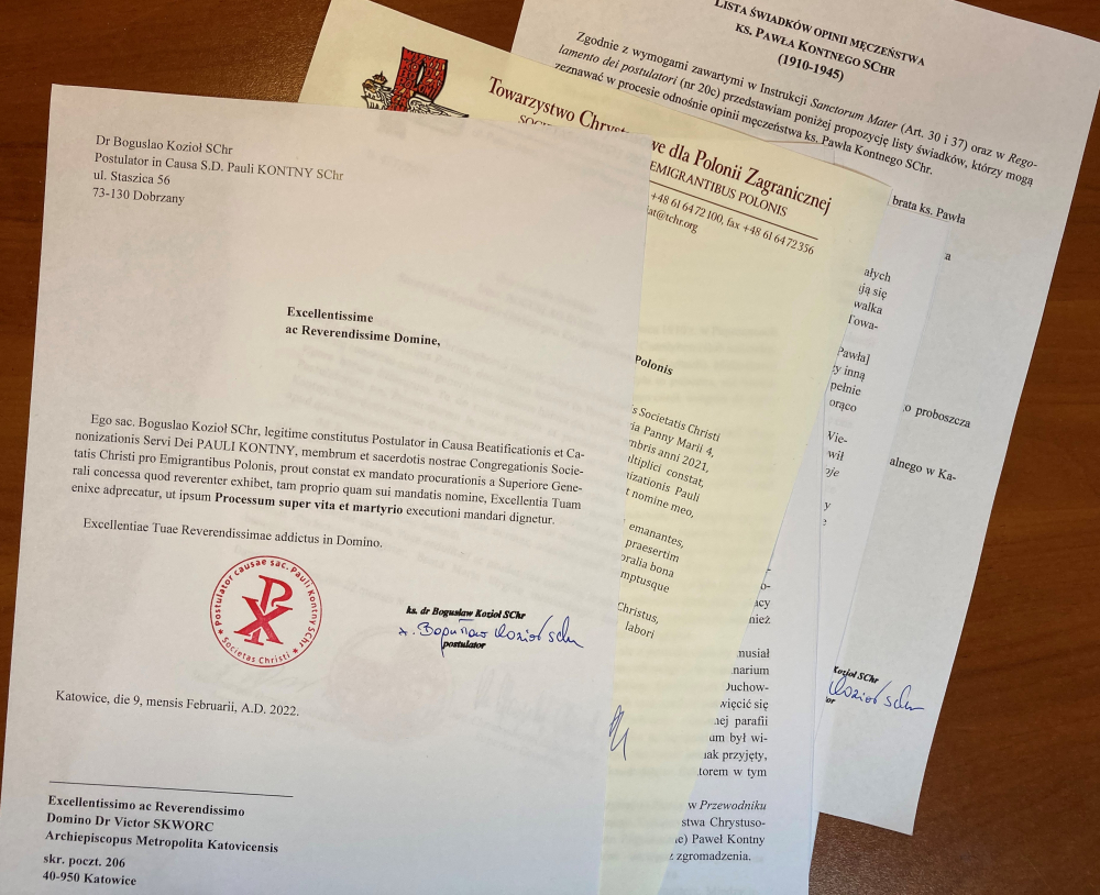 Po wcześniejszych pracach przygotowawczych, postulator procesu ks. Bogusław Kozioł SChr złożył 9 lutego 2022 u abp. Wiktora Skworca tzw. Suplex libellus, czyli oficjalną prośbę o rozpoczęcie procesu beatyfikacyjnego ks. Pawła Kontnego SChr. Do prośby, zgodnie z wymogami prawa kanonizacyjnego, zostały dołączone dokumenty: 1) Dekret nominacyjny na postulatora; 2) Biografia ks. Pawła, wraz z krótką chronologią jego życia; 3) Opis męczeńskiej śmierci; 4) Lista świadków, którzy mogliby złożyć zeznanie o trwającej opinii męczeństwa; 5) Historia trwającego nieprzerwanie od śmierci przekonania ludzi o męczeńskiej śmierci; 6) Wyjaśnienie dlaczego prośba o wszczęcie procesu jest składana tak późno (data graniczna to 30 lat po śmierci); 7) Bibliografia zebranej do tej pory dokumentacji wraz z deklaracją braku pism drukowanych ks. Pawła; 8) Prośba o wyznaczenie wicepostulatora z diecezji katowickiej.