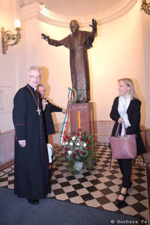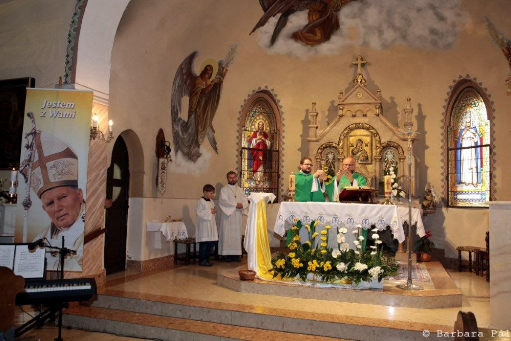 Całość rozpoczęła uroczysta niedzielna Msza Święta, która była też wspomnieniem o św. Janie Pawle II. Przez Jego wstawiennictwo wspólnie modliliśmy się o ustanie pandemii, oraz za osoby dotknięte tą chorobą. Wśród wiernych trzeba podkreślić obecność dostojnych gości: rzecznika narodowości polskiej w Zgromadzeniu Narodowym Węgier, przedstawicieli Samorządów Polskich na Węgrzech, przedstawicieli Ambasady RP. Oprawę muzyczną Mszy zapewnił zespół rodzinny „Kleksiki”. Po jej zakończeniu odbyła się prezentacja, wydanego staraniem węgierskiego wydawnictwa, albumu poświęconemu naszemu wielkiemu Rodakowi opatrzonego tytułem: „Jan Paweł II święty niepodległości”. Kwotę uzyskaną ze sprzedaży albumu (dobrowolne ofiary-cegiełki) postanowiono przeznaczyć na wsparcie studentów pochodzących z Białorusi, a studiujących w Polsce. Po prezentacji albumu w ogrodzie Domu Polskiego przybyłych poczęstowano przysłowiowymi «papieskimi» kremówkami. Na murach kościoła oraz w Domu Polskim Instytut Pamięci Narodowej zaprezentował wystawę pt. „Wyszyńskiego i Wojtyły gramatyka życia”.