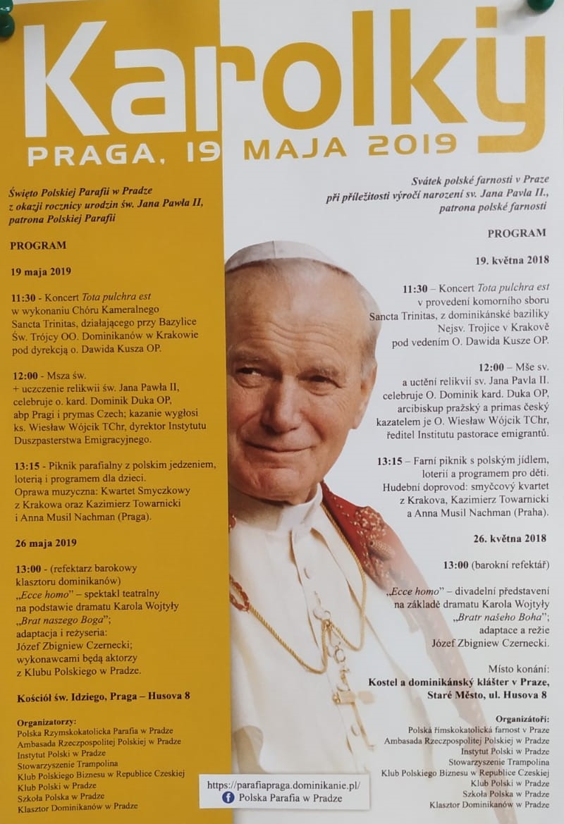 W niedzielę 19 maja 2019 roku w Polskiej Parafii pw. św. Jana Pawła II przy kościele św. Idziego i klasztorze dominikanów odbyły się "Karolki" - doroczne święto praskiej Polonii i Polaków. Odbywają się już od pięciu lat i przygotowywane są dla upamiętnienia 99. rocznicy urodzin Patrona Emigracji Polskiej Jana Pawła II.