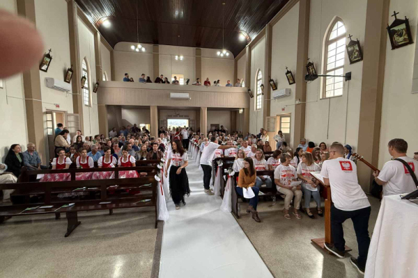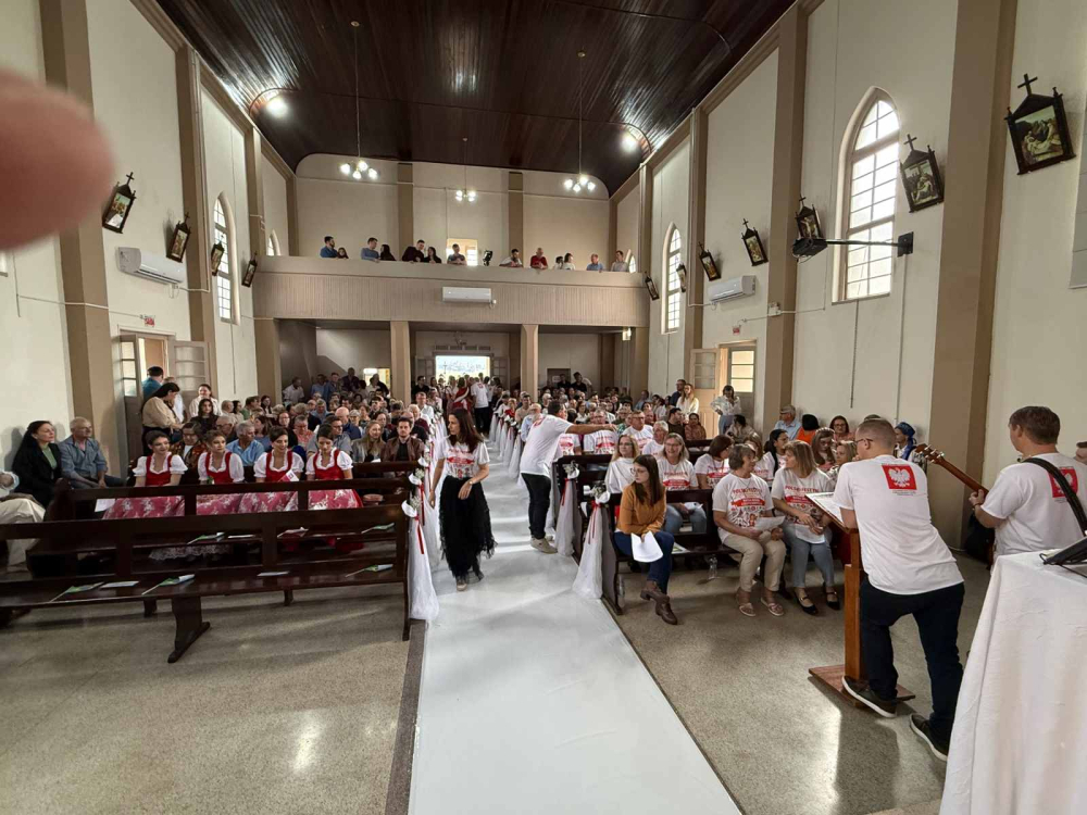 Wróćmy jednak do niedzielnych wydarzeń… Liturgia rozpoczęła się uroczystą procesją do głównego ołtarza. W procesji niesiono duży i już stary obraz Pani Jasnogórskiej oraz , portret św. Jana Pawła II. Te wizerunki poprzedzały grupę dzieci w kolorowych koszulkach (o których już wspomniano powyżej), nadzwyczajnych szafarzy Komunii Świętej oraz ministrantów. Do procesji włączył się również przybyły z miasta São Bento do Sul zespół folkloru polskiego Hercílio Malinowski. (To odległe o 30 km miasto liczy ponad 80 tys. mieszkańców, w tym 25 tys. osób polskiego pochodzenia). I trzeba przyznać szczerze, że jednym z wyróżników tej wspólnoty wydaje się być bardzo głośny i gromki śpiew polskich pieśni religijnych oraz poprawny język polski w śpiewanych pieśniach, odczytywanych czytaniach podczas liturgii słowa i wezwań modlitwy powszechnej. Podziwiałem tę poprawną polszczyznę i można było odczułem, że kościół wypełniony wiernymi śpiewał i modlił się z głębi polskiej duszy, w duchu wielkiego przeżycia duchowego.