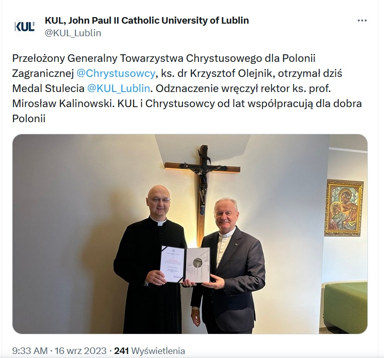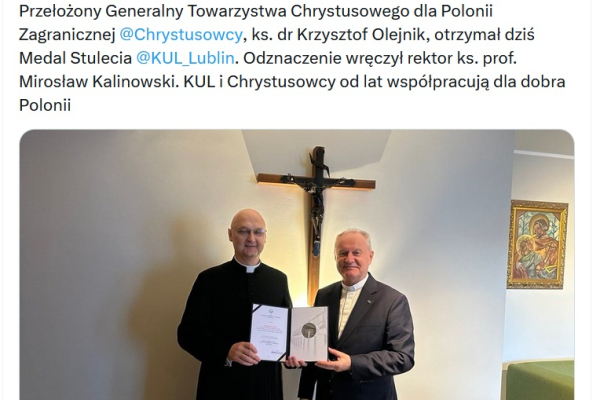 Jak możemy wyczytać ze społecznościowych kanałów Katolickiego Uniwersytetu Lubelskiego Jana Pawła II w Lublinie w sobotę 16 września 2023 r., przy okazji odbywającego się w Poznaniu XV Ogólnopolskiego Forum Duszpasterskiego, ks. Krzysztof Olejnik SChr, przełożony generalny Towarzystwa Chrystusowego odebrał z rąk ks. prof. Mirosława Kalinowskiego, rektora KULu «Medal Jubileuszowy 100-Lecia Katolickiego Uniwersytetu Lubelskiego Jana Pawła II». Wiosną 2023 r. podobnie została uhonorowana nasza prowincja północnoamerykańska. Z tą lubelską uczelnią wiele nas łączy: wspólnie podejmujemy wiele inicjatyw na rzecz Polonii, związanych szczególnie z zabezpieczeniem i promocją jej dziedzictwa kulturowego. Należy również dodać, że przez lata chrystusowcy wieńczyli swoje filozoficzno-teologiczne studia seminaryjne, uzyskując tytuły magistra teologii właśnie w Katolickim Uniwersytecie Lubelskim. Inni podejmowali na lubelskiej uczelni dalsze studia i uzyskiwali stopnie naukowe bądź doktora teologii, bądź doktora nauk społecznych, bądź doktora nauk humanistycznych. Obecnie na Wydziale Nauk Społecznych KUL studia specjalistyczne odbywa ks. Wojciech Mula SChr.