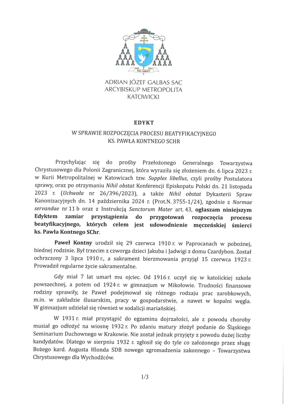 Przychylając się do prośby Przełożonego Generalnego Towarzystwa Chrystusowego dla Polonii Zagranicznej, która wyraziła się złożeniem dn. 6 lipca 2023 r. w Kurii Metropolitalnej w Katowicach tzw. Supplex libellus, czyli prośby Postulatora sprawy, oraz po otrzymaniu Nihil obstat Konferencji Episkopatu Polski dn. 21 listopada 2023 r. (Uchwała nr 26/396/2023), a także Nihil obstat Dykasterii Spraw Kanonizacyjnych dn. 14 października 2024 r. (Prot.N. 3755-1/24), zgodnie z Normae servandae nr 11 b oraz z Instrukcją Sanctorum Mater art. 43, ogłaszam niniejszym EDYKTEM zamiar przystąpienia do przygotowań rozpoczęcia procesu beatyfikacyjnego, których celem jest udowodnienie męczeńskiej śmierci ks. Pawła Kontnego SChr.