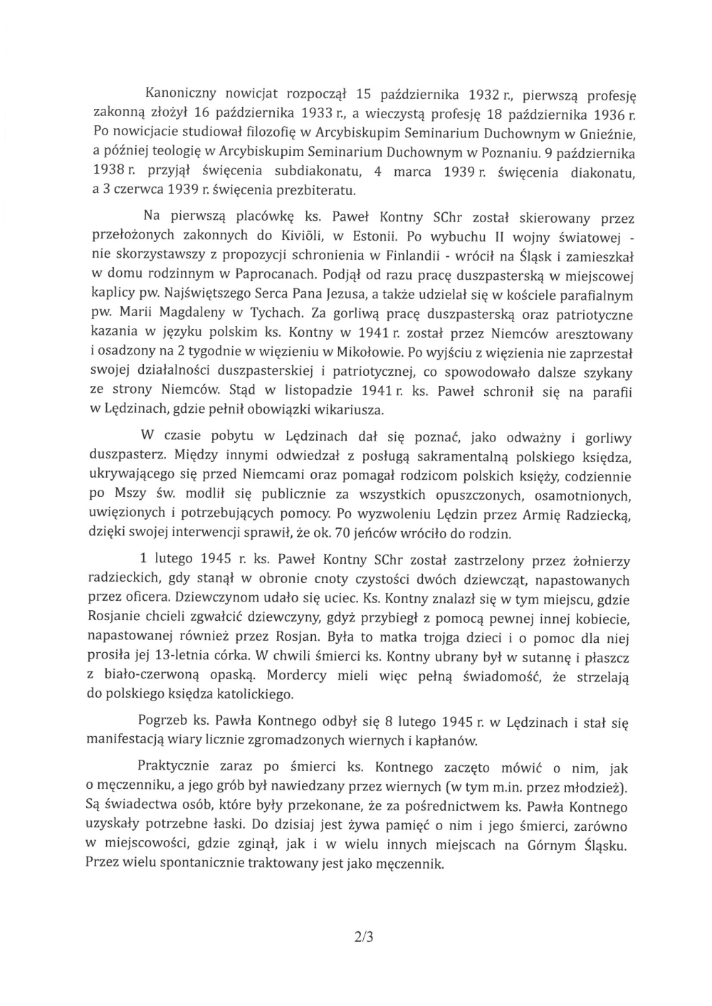 1 lutego 1945 r. ks. Paweł Kontny SChr został zastrzelony przez żołnierzy radzieckich, gdy stanął w obronie cnoty czystości dwóch dziewcząt, napastowanych przez oficera. Dziewczynom udało się uciec. Ks. Kontny znalazł się w tym miejscu, gdzie Rosjanie chcieli zgwałcić dziewczyny, gdyż przybiegł z pomocą pewnej innej kobiecie, napastowanej również przez Rosjan. Była to matka trojga dzieci i o pomoc dla niej prosiła jej 13-letnia córka. W chwili śmierci ks. Kontny ubrany był w sutannę i płaszcz z biało-czerwoną opaską. Mordercy mieli więc pełną świadomość, że strzelają do polskiego księdza katolickiego.