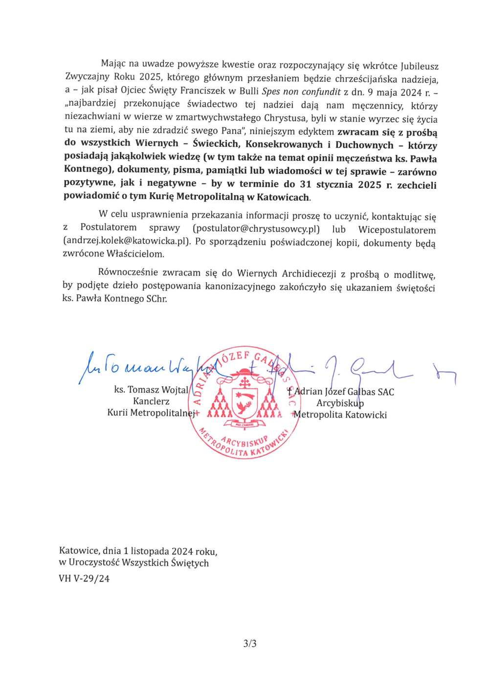 Mając na uwadze powyższe kwestie oraz rozpoczynający się wkrótce Jubileusz Zwyczajny Roku 2025, którego głównym przesłaniem będzie chrześcijańska nadzieja, a – jak pisał Ojciec Święty Franciszek w Bulli Spes non confundit z dn. 9 maja 2024 r. – „najbardziej przekonujące świadectwo tej nadziei dają nam męczennicy, którzy niezachwiani w wierze w zmartwychwstałego Chrystusa, byli w stanie wyrzec się życia tu na ziemi, aby nie zdradzić swego Pana”, niniejszym edyktem zwracam się z prośbą do wszystkich Wiernych – Świeckich, Konsekrowanych i Duchownych – którzy posiadają jakąkolwiek wiedzę (w tym także na temat opinii męczeństwa ks. P. Kontnego), dokumenty, pisma, pamiątki lub wiadomości w tej sprawie – zarówno pozytywne, jak i negatywne – by w terminie do 31 stycznia 2025 r. zechcieli powiadomić o tym Kurię Metropolitalną w Katowicach.