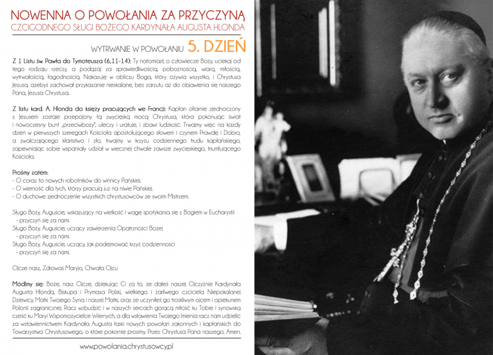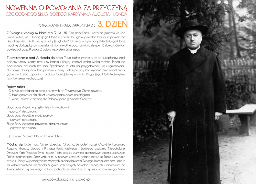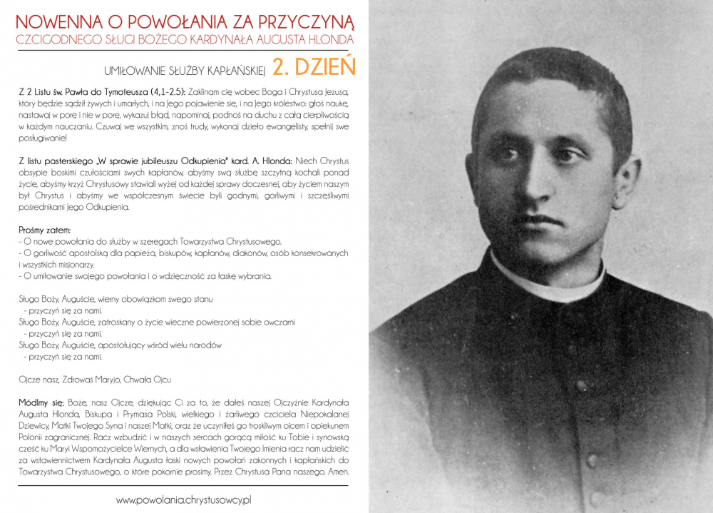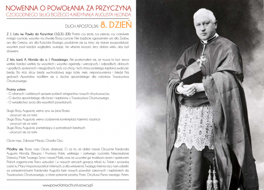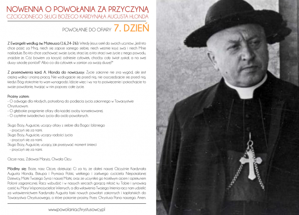 Włączamy się do tego wołania o powołania do służby Bożej w Kościele, o powołania do naszego zgromadzenia przyzywając wstawiennictwa Czcigodnego Sługi Bożego kard. Augusta Hlonda, naszego Założyciela. Szczególnym czasem tej modlitwy jest przypadający rokrocznie w IV Niedzielę Wielkanocy Światowy Dzień Modlitw o Powołania: nasi klerycy z zapałem podjęli tę modlitewną akcję. Zachęcamy wszystkich ludzi dobrej woli do włączenia się do wspólnej modlitwy…