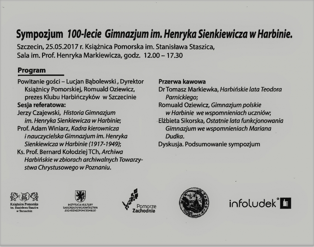 25 maja 2017r. zostało zorganizowane przez Klub Harbińczyków w Szczecinie sympozjum poświęcone 100 - leciu Gimnazjum im. Henryka Sienkiewicza w Harbinie. Wziął w nim udział ks. prof. Bernard Kołodziej SChr, zajmujący się na co dzień problematyką polonijną. Wygłosił tam referat: Archiwa Harbińskie w zbiorach archiwalnych Towarzystwa Chrystusowego w Poznaniu.