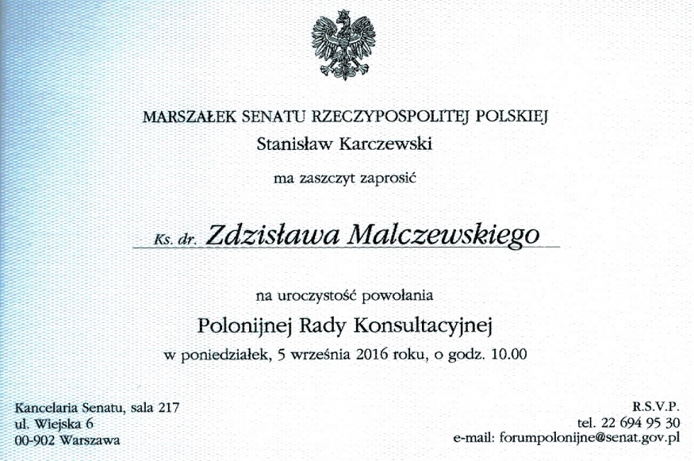 Marszałek Senatu Stanisław Karczewski powołał naszego współbrata ks. Zdzisłąwa Malczewskiego SChr w skład Polonijnej Rady Konsultacyjnej przy Marszałku Senatu RP. Jest to organ doradczy marszałka Senatu w sprawach Polonii i Polaków za granicą. Warto nadmienić, że ks. Malczewski jest jedynym duchownym w tej Radzie.
