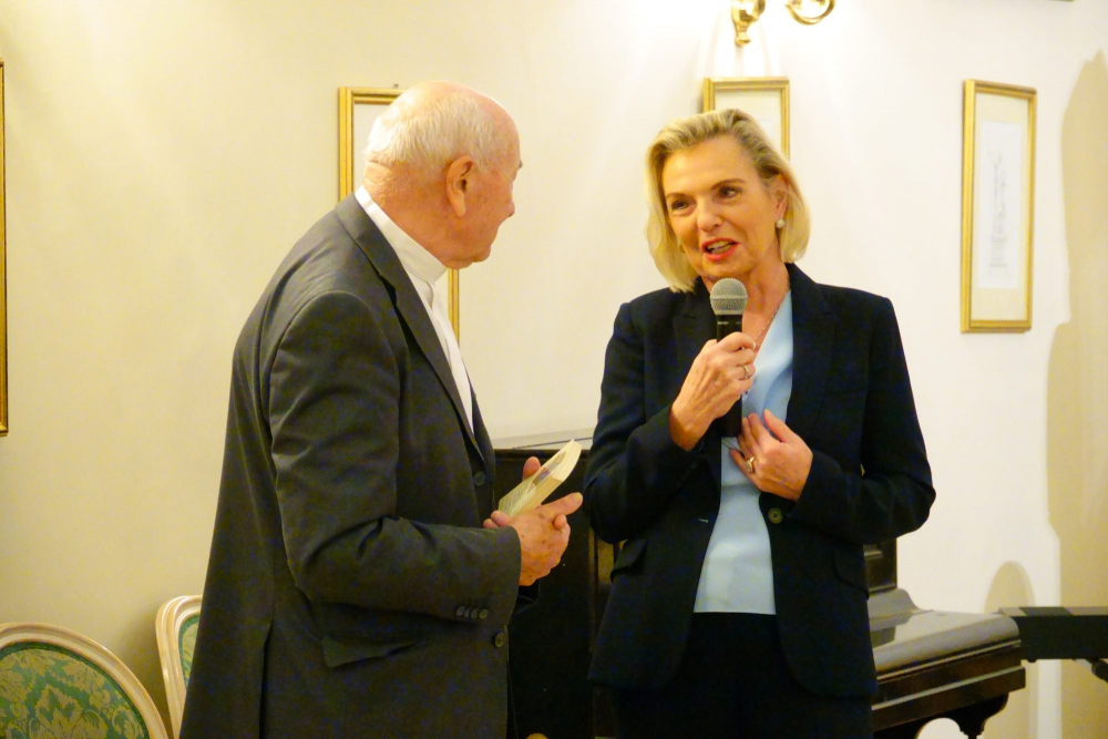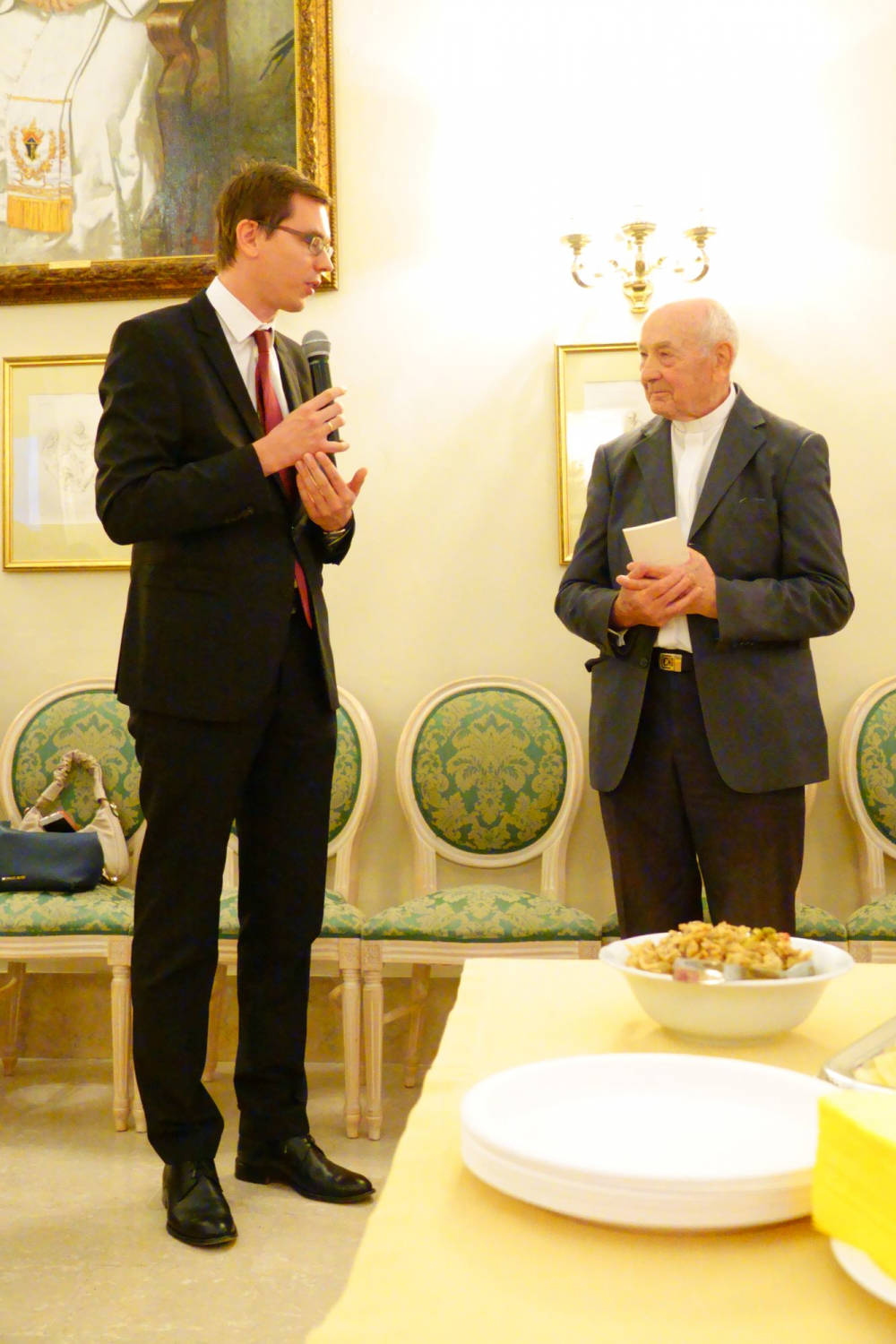 Po liturgii licznie zgromadzeni goście przeszli do Auli, gdzie słowa wdzięczności za długoletnią posługę na chwałę  Boga i pożytkowi naszych rodaków zamieszkujących Italię, popłynęły od przedstawicieli Kościoła, Towarzystwa, polskiej dyplomacji oraz organizacji polonijnych. Każdy miał okazję, aby podczas poczęstunku, móc osobiście pożegnać się z ks. Marianem, który do Rzymu przybył w roku 1961, a wkrótce zamieszka w naszym domu zakonnym w Puszczykowie.