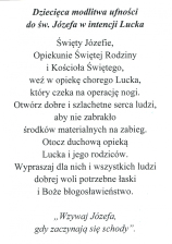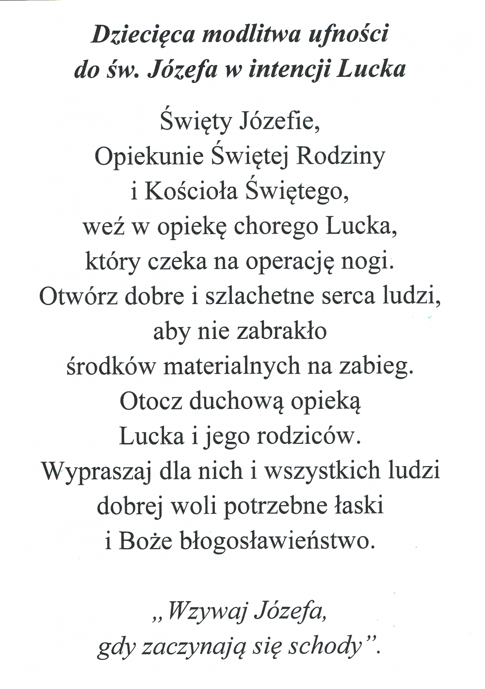 A ponieważ nie wszystkie dzieci mogą już korzystać ze spowiedzi, dzięki pomysłowi proboszcza ks. Jana Dziducha SChr, mogły na spotkanie z Bożą Dzieciną przygotować się w inny sposób. Zorganizowana została bowiem akcja wsparcia dobrymi uczynkami ośmiomiesięcznego Lucka i jego rodziców, którzy zbierają środki na kosztowną operację. Z jednej z nauk zapamiętały słowa: „Wezwij Józefa, gdy zaczynają się schody”. Ufne w to, że św. Józef otoczy opieką małe dziecko, jak to zrobił wobec Pana Jezusa, nie ustają w modlitwie, która została zamieszczona na jednym ze zdjęć. Wierzą, że i inne dzieci przyłączą się do wspólnego szturmowania nieba.