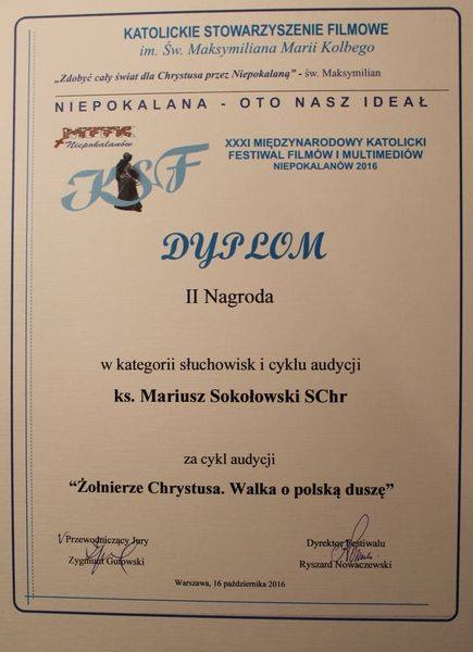 Jury XXXI Międzynarodowego Katolickiego Festiwalu Filmów i Multimediów "NIEPOKALANÓW 2016" przyznało naszemu współbratu ks. Mariuszowi Sokołowskiemu SChr II NAGRODĘ w kategorii Program Radiowy (Słuchowiska i cykle audycji) za "Żołnierze Chrystusa. Walka o polską duszę" oraz projekt "SIOSTRY".