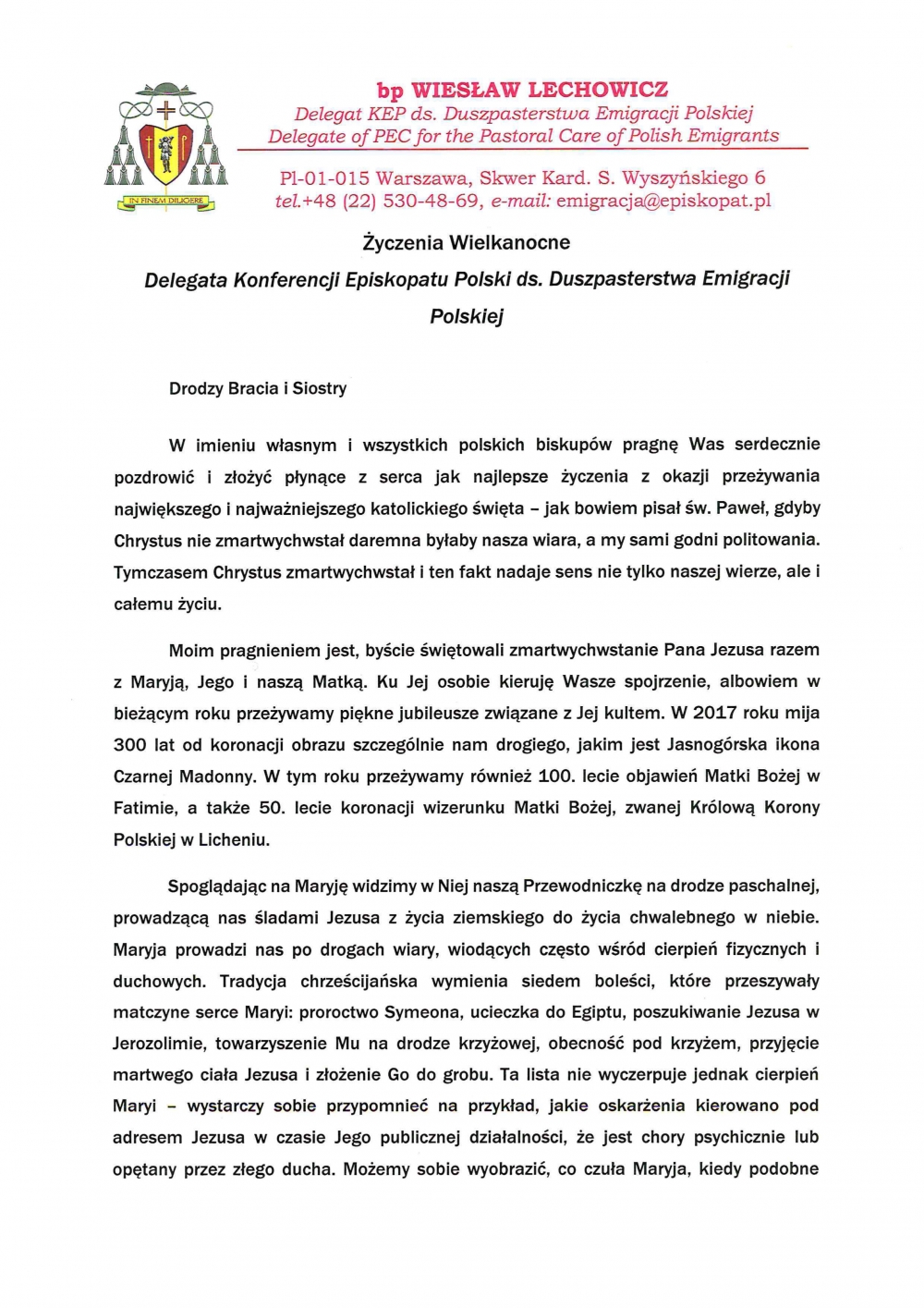 Ksiądz biskup Wiesław Lechowicz, Delegat Konferencji Episkopatu Polski ds. Duszpasterstwa Emigracji Polskiej z okazji świąt Wielkanocnych skierował życzenia do Polonii całego świata.