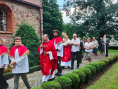 W wygłoszonej homilii Arcybiskup podjął kilka wątków: najpierw odniósł się do potrzeby szacunku wobec Bożych darów – plonów ziemi, następnie do św. Stanisława Kostki Patrona lokalnej społeczności i kościoła, wskazując na jego świętość i znaczenie tej świętości w naszym życiu, a na zakończenie do XVI-wiecznej świątyni w Mielnie, która od pięciu wieków służy modlitwie mieszkających tu ludzi i jest znakiem wiary, obecności Boga i chrześcijaństwa na tych ziemiach. Wskazał przy tym na wielkie znaczenie misji św. Ottona z Bambergu (w ubiegłym, 2024 roku na Pomorzu obchodzono uroczyście Rok Jubileuszowy 900-lecia Misji Pomorskiej Świętego Ottona) oraz na kontekst ostatnich 80 lat życia kościoła katolickiego w tym miejscu i na aktualną troskę o świątynię. Na zakończenie liturgii oddaliśmy cześć św. Stanisławowi Kostce, odmawiając litanię ku jego czci. Potem odbyła się procesja wokół kościoła, odśpiewaliśmy hymn Ciebie Boga wysławiamy, a uroczyste błogosławieństwo zakończyło naszą modlitwę. Po uroczystościach w kościele udaliśmy się do świetlicy wiejskiej na dalsze świętowanie podczas pięknie przygotowanej Agapy, za którą odpowiadała Pani Sołtys, Rada Sołecka, Rada Duszpasterska i parafianie przy wsparciu miejscowych rolników.