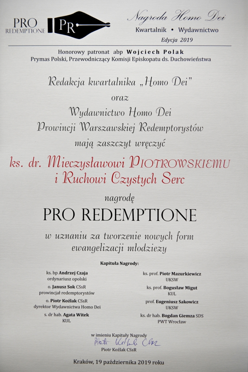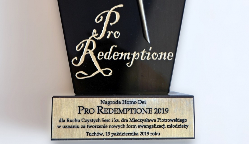 Ksiądz Mieczysław Piotrowski SChr i Ruch Czystych Serc otrzymali prestiżową nagrodę „Pro Redemptione” w kategorii „ewangelizacja młodzieży”. Wyróżnienie przyznawane jest od 2014 r. przez kwartalnik i wydawnictwo HOMO DEI. Uroczystość wręczenia nagród odbyła się 19 października 2019 r. w gmachu Wyższego Seminarium Duchownego Redemptorystów w Tuchowie. Poprzedzona została sympozjum na temat św. Gerarda Majelli.