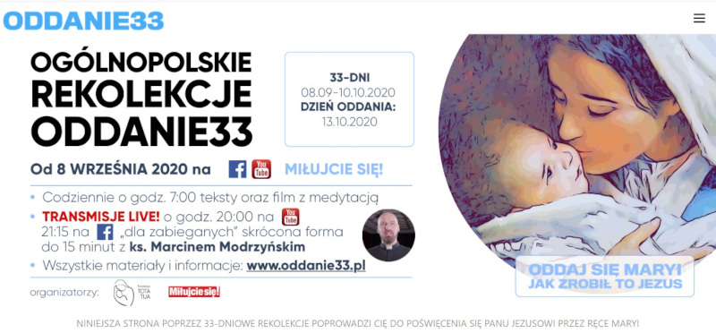 Wydawany przez nasze zgromadzenie ewangelizacyjny dwumiesięcznik „Miłujcie się” jest organizatorem ogólnopolskich rekolekcji przygotowujących do całkowitego oddania się Maryi i Jezusowi na podstawie „Traktatu o prawdziwym nabożeństwie do Najświętszej Maryi Panny” św. Ludwika Marii Grignion de Montfort. Rozpoczynają się one w wyjątkowym dniu – w święto Narodzenia NMP i trwać będą 33 dni. Serdecznie zapraszamy do uczestnictwa bądź przez internetowy serwis tego projektu, bądź stronę www „Miłujcie się”, bądź fanpage tegoż czasopisma na Facebooku. Tam też znaleźć można więcej szczegółów dotyczących całego projektu i samych rekolekcji wraz z videozaproszeniami do wzięcia udziału.