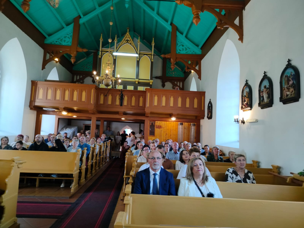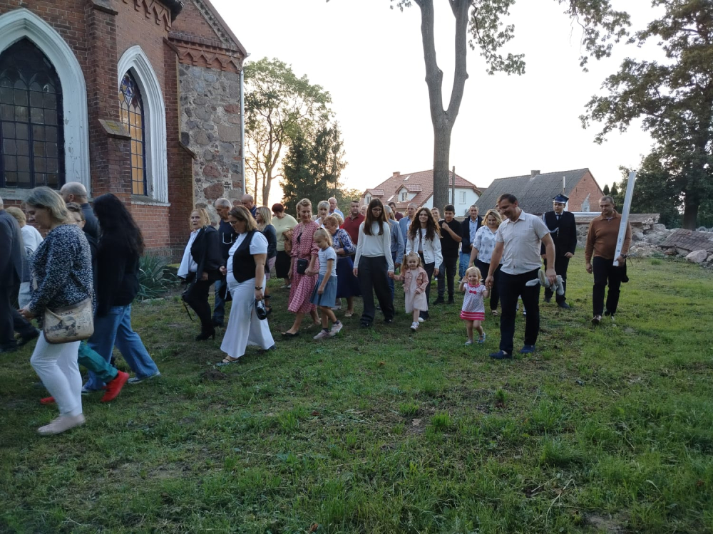 W wygłoszonej homilii Arcybiskup podjął kilka wątków: najpierw odniósł się do potrzeby szacunku wobec Bożych darów – plonów ziemi, następnie do św. Stanisława Kostki Patrona lokalnej społeczności i kościoła, wskazując na jego świętość i znaczenie tej świętości w naszym życiu, a na zakończenie do XVI-wiecznej świątyni w Mielnie, która od pięciu wieków służy modlitwie mieszkających tu ludzi i jest znakiem wiary, obecności Boga i chrześcijaństwa na tych ziemiach. Wskazał przy tym na wielkie znaczenie misji św. Ottona z Bambergu (w ubiegłym, 2024 roku na Pomorzu obchodzono uroczyście Rok Jubileuszowy 900-lecia Misji Pomorskiej Świętego Ottona) oraz na kontekst ostatnich 80 lat życia kościoła katolickiego w tym miejscu i na aktualną troskę o świątynię. Na zakończenie liturgii oddaliśmy cześć św. Stanisławowi Kostce, odmawiając litanię ku jego czci. Potem odbyła się procesja wokół kościoła, odśpiewaliśmy hymn Ciebie Boga wysławiamy, a uroczyste błogosławieństwo zakończyło naszą modlitwę. Po uroczystościach w kościele udaliśmy się do świetlicy wiejskiej na dalsze świętowanie podczas pięknie przygotowanej Agapy, za którą odpowiadała Pani Sołtys, Rada Sołecka, Rada Duszpasterska i parafianie przy wsparciu miejscowych rolników.