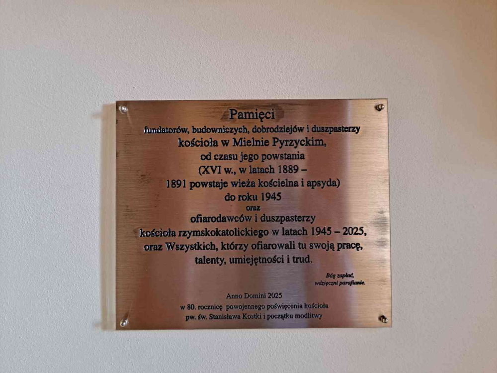 Kolejne święto w kalendarzu liturgicznym to przypadające 18 września święto św. Stanisława Kostki, Patrona Polski, dzieci, młodzieży i ministrantów, a także Patrona kościoła filialnego i społeczności w Mielnie Pyrzyckim. W ipsa die rozpoczęliśmy Triduum ku czci św. Stanisława Kostki: zgromadzeni w mieleńskim kościele modlitwą za młode pokolenie włączyliśmy się w kończący się w naszej ojczyźnie Tydzień Wychowania, w piątek 19 września na cmentarzu modliliśmy się za zmarłych mieszkańców Mielna i całej parafii. Natomiast w sobotę 20 września 2025 r. odbyły się główne uroczystości odpustowo-rocznicowe, na które przybył abp Andrzej Dzięga, abp senior archidiecezji szczecińsko-kamieńskiej, (który przewodniczył Mszy Świętej i wygłosił homilię), Piotr Rybkowski, wójt gminy Kozielice, księża z sąsiednich parafii, mieszkańcy Mielna, parafianie oraz wielu pielgrzymów spoza parafii, w tym również ze Szczecina. Celebracja ta stała się zarazem okazją do rozpoczęcia blisko rocznego dziękczynienia za 80 lat modlitwy i sprawowania liturgii w dwóch kościołach parafii – parafialnego w Kozielicach i filialnego w Mielnie Pyrzyckim, licząc od dnia powojennego poświęcenia i początku modlitwy. (Kościół w Kozielicach został poświęcony 21 sierpnia 1945 r., a kościół w Mielnie Pyrzyckim – 22 sierpnia 1945 r. przez ks. Józefa Króla z Lipian). Włączono w nią również dziękczynienie za tegoroczne zbiory. Po powitaniu przez ks. proboszcza Jarosława Bilickiego i sołtys Mielna Panią Iwonę Kiryczyńską Ksiądz Arcybiskup poświęcił wieniec dożynkowy, a następnie wyremontowaną kruchtę kościoła wraz z drzwiami głównymi oraz odnowione figury Niepokalanego Serca Maryi i Świętego Józefa z Dzieciątkiem Jezus na ręku. Pobłogosławił również nowy krzyż w kruchcie kościoła. Przy okazji też została odsłonięta tablica upamiętniająca duszpasterzy oraz fundatorów, budowniczych i ofiarodawców kościoła.