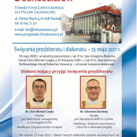 We wtorek 25 maja 2021 r. w katedrze poznańskiej zostali wyświęceni na prezbiterów diakoni: Chris Czapla i Sebastian Stawierej. Święcenia diakonatu otrzymał kleryk Paweł Hałgas.