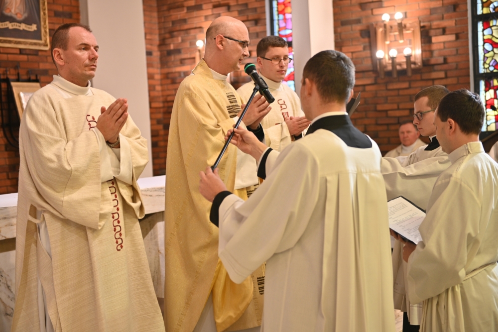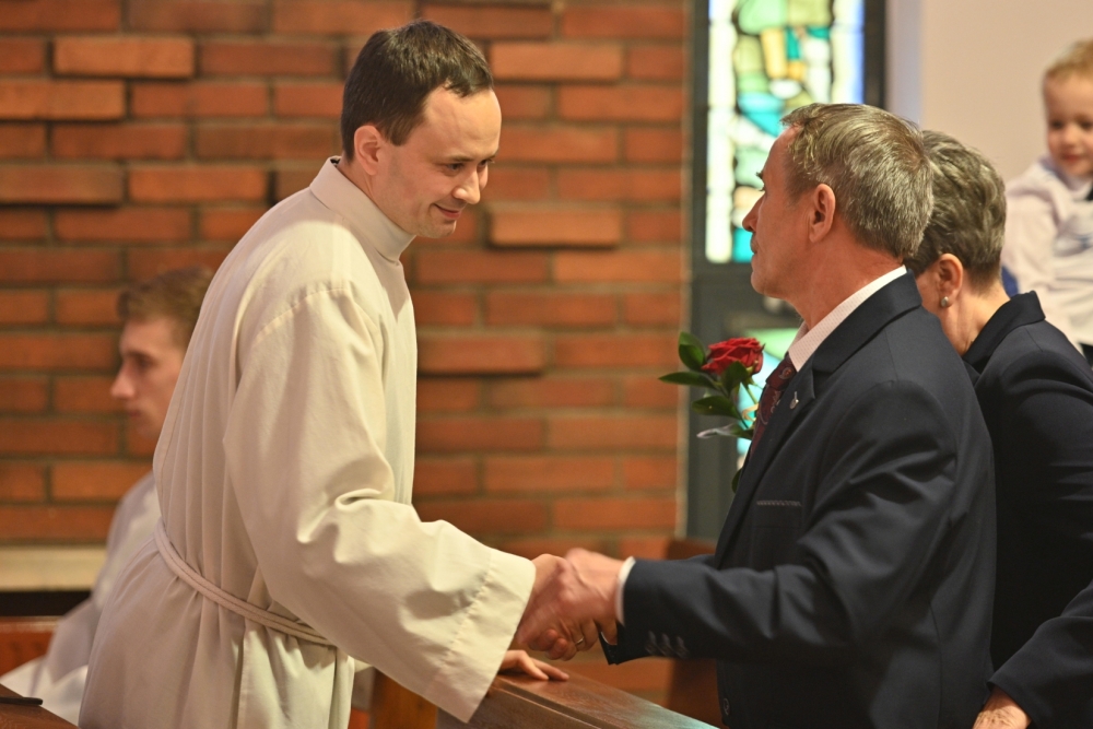 Dodajmy nieco żartobliwie, że delikatny stres udzielał się nie tylko nowo ustanowionemu diakonowi, ale też naszemu przełożonemu generalnemu ks. Krzysztofowi Olejnikowi SChr, który po raz pierwszy odbierał zakonne ślubowania oraz Księdzu Biskupowi, który również po raz pierwszy udzielał sakramentu święceń…