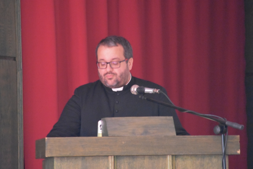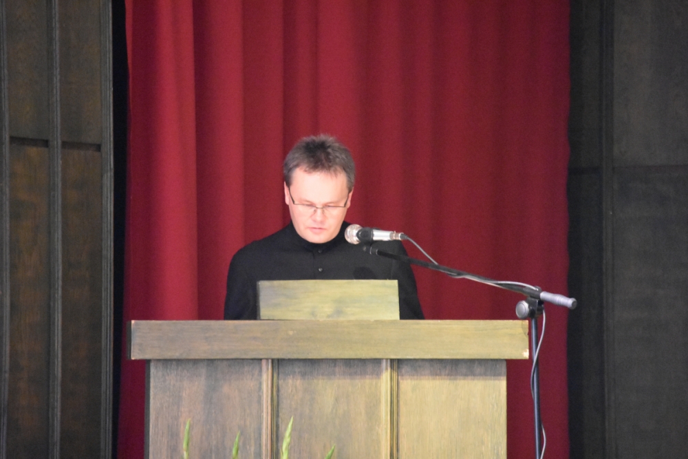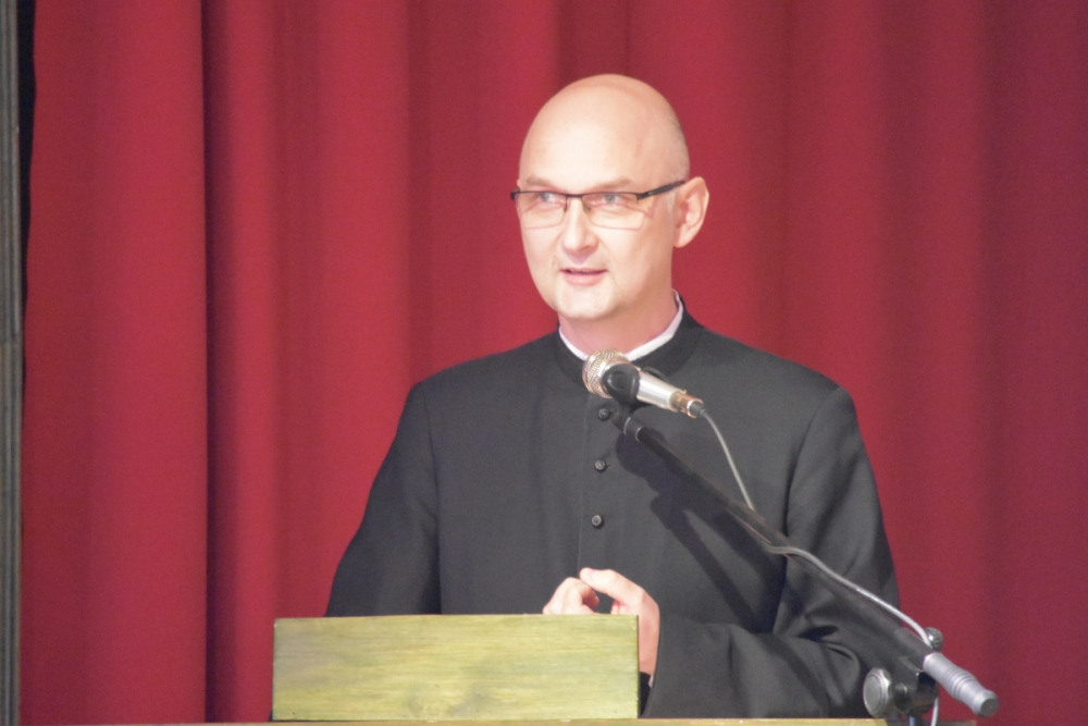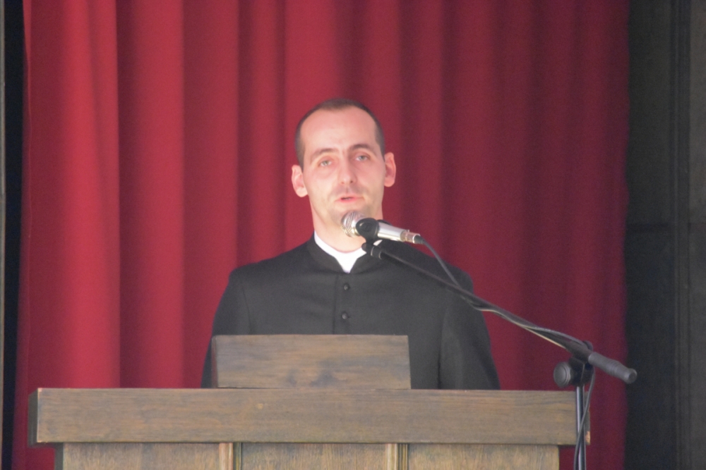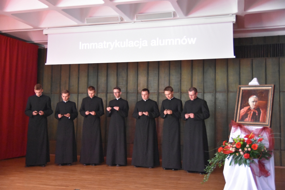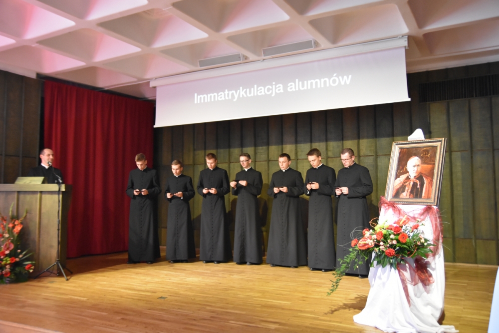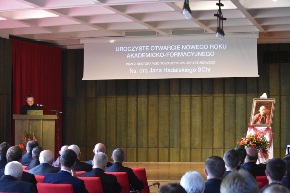 Po zakończonej liturgii uczestnicy przeszli do auli, gdzie niedawno ustanowiony nowy Rektor Wyższego Seminarium Duchownego Towarzystwa Chrystusowego, ks. dr Jan Hadalski SChr, otwierając rok akademicko-fromacyjny 2019/2020, charakteryzował jego istotę: czym on jest, i co jest jego celem. A jest nim pogłębienie przyjaźni z Chrystusem i odkrywanie swojej tożsamości jako kapłana i zakonnika, jako chrystusowca: albowiem właściwy system wartości, uporządkowany program życia, postawienie sobie odpowiednich celów pomaga w stawaniu się prawdziwym uczniem i świadkiem Pana. Dlatego, mówił ks. rektor, by to móc realizować, w bieżącym roku „chcemy się skupić w naszym seminarium właśnie nad kształtowaniem ducha ofiary. Towarzyszyć nam będą, jako motto, słowa założyciela naszego zgromadzenia, Czcigodnego Sługi Bożego kardynała Augusta Hlonda: Powróćmy do ofiary totalnej! Wszystko dla Boga! Wszystko dla dusz!”.