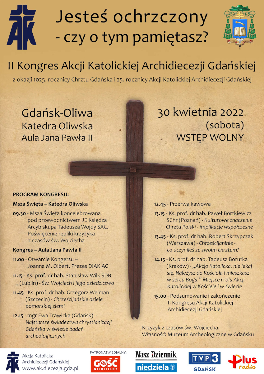 „Jesteś ochrzczony – czy o tym pamiętasz?” – pod takim hasłem odbywał się także w sobotę 30 kwietnia 2022 r. II kongres Akcji Katolickiej Archidiecezji Gdańskiej z okazji 1025 rocznicy chrztu Gdańska i 25-lecia istnienia Akcji Katolickiej. Uczestniczył w nim nasz Współbrat, ks. prof. Paweł Bortkiewicz SChr z przedłożeniem pt. Kulturowe znaczenie Chrztu Polski – implikacje współczesne.