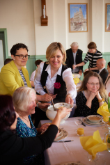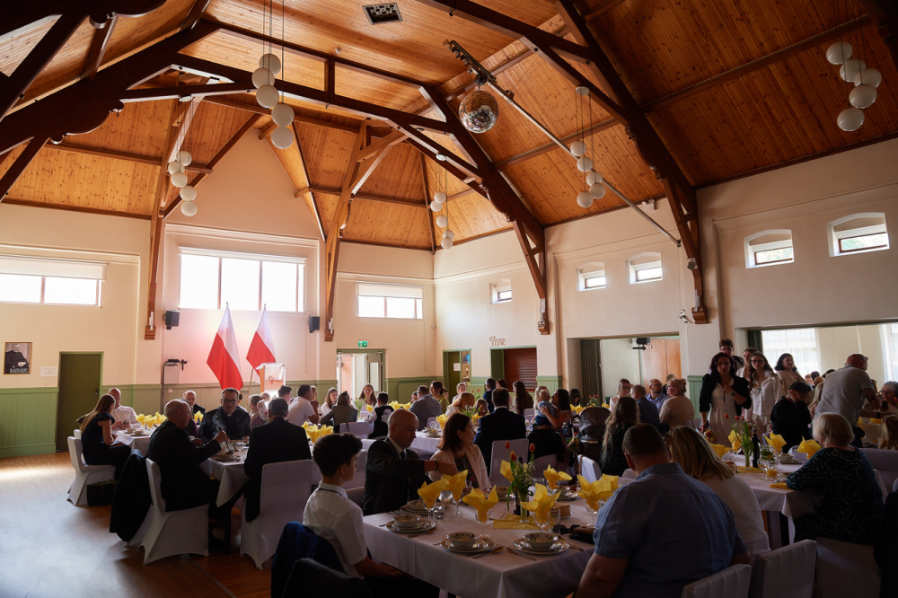 Po uroczystej Mszy Świętej na sali parafialnej odbył się obiad, w trakcie którego dalej świętowaliśmy imieniny naszej parafii. Nie mogło zabraknąć modlitwy oraz toastu za Miłosierdzie Boże w Manchester…