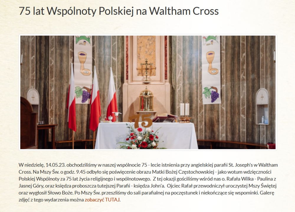 W niedzielę 14 maja 2023 r. polonijna wspólnota Forest Gate-Ilford-Waltham Cross obchodziła jubileusz 75-lecia istnienia przy angielskiej parafii St. Joseph’s w Waltham Cross. Z tej okazji gościliśmy wśród nas o. Rafała Wilka OSSPE, paulina z Jasnej Góry oraz ks. Johna Cunninghama, proboszcza miejscowej parafii katolickiej. Ojciec Rafał przewodniczył uroczystej Mszy Świętej o godz. 9.45 oraz wygłosił Słowo Boże. Podczas liturgii odbyło się poświęcenie obrazu Matki Bożej Częstochowskiej – wotum wdzięczności Polskiej Wspólnoty za 75 lat życia religijnego i wspólnotowego. Po zakończonej Mszy jej uczestnicy przeszli do sali parafialnej na poczęstunek i niekończące się wspominki.