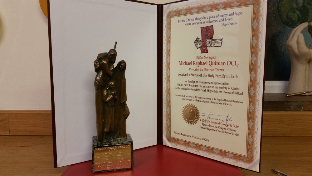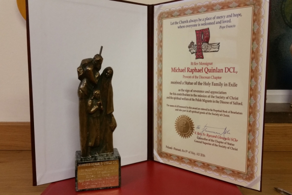 W uznaniu zasług i roli, jaką prałat Michael Quinlan (były wikariusz generalny i kanclerz kurii) odegrał w zapewnieniu należytej opieki duszpasterskiej Polakom w diecezji Salford, przełożony generalny Towarzystwa Chrystusowego ks. Ryszard Głowacki SChr, postanowił uhonorować Jubilata, przeżywającego w tym roku Złotą Rocznicę Święceń, specjalną nagrodą przyznawaną tylko raz w roku.
