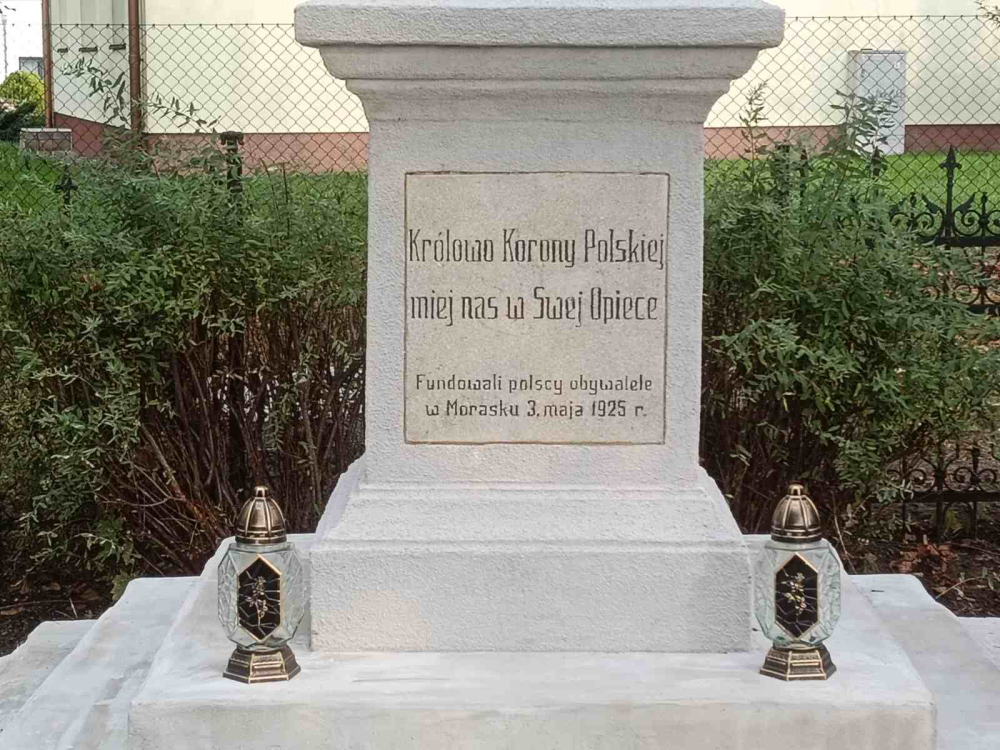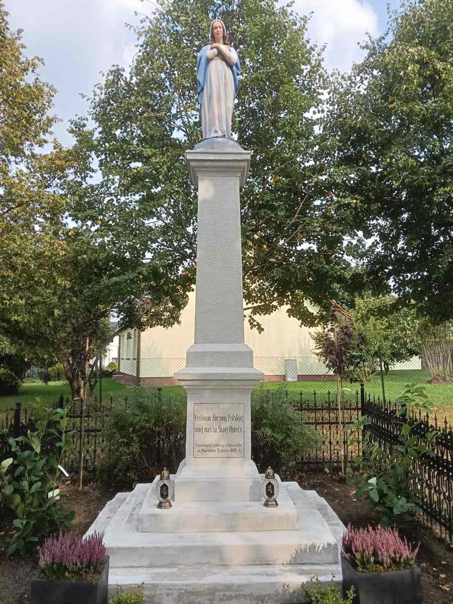 Królowo Korony Polskiej, miej nas w swojej opiece! – napis umieszczony na cokole statuy był modlitwą ją stawiających z okazji obchodzonego w całej Polsce po raz pierwszy święta ku czci NMP Królowej Polski (jak stanowi potwierdzony autorytetem papieża Piusa XI dekret Kongregacji Świętych Obrzędów zob. „Miesięcznik Kościelny dla Archidiecezji Gnieźnieńskiej i Poznańskiej” R. 39[1924], nr 12, s. 72), potem modlitwą tych, którzy po II wojnie światowej wznieśli kolejną (bo tę pierwszą zniszczyli niemieccy okupanci w noc sylwestrową 1939 r.) i jest wołaniem współczesnego pokolenia wiernych parafii Ścięcia św. Jana Chrzciciela (w dniu poświęcenia odnowionej figury, a także na co dzień, gdy przy niej będziemy się spotykać by chwalić Pannę Świętą, naszą Matkę, Królową i Opiekunkę).
