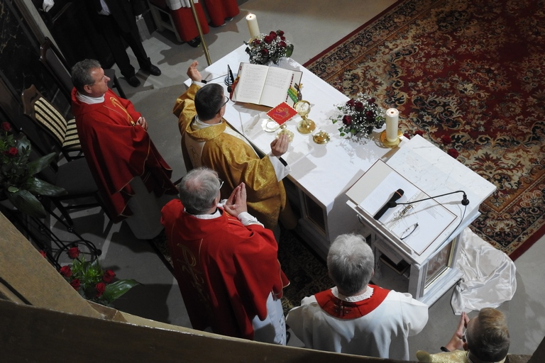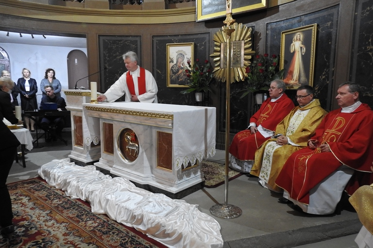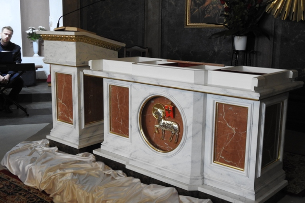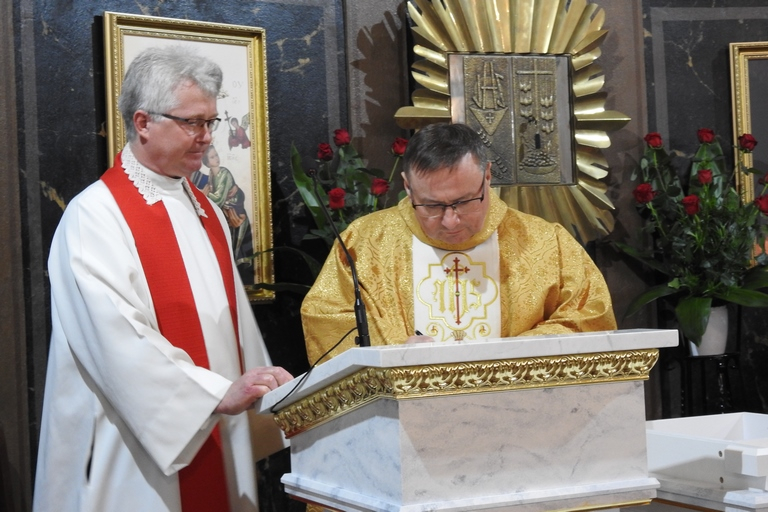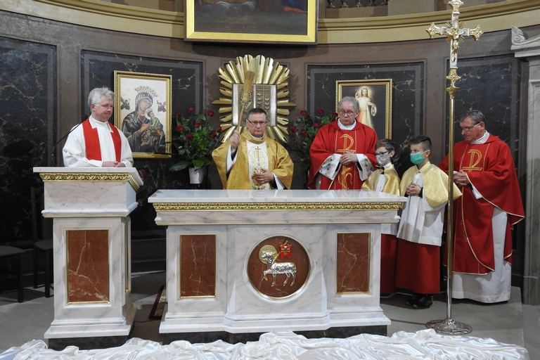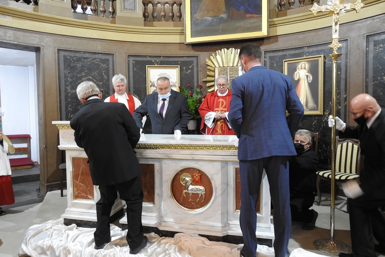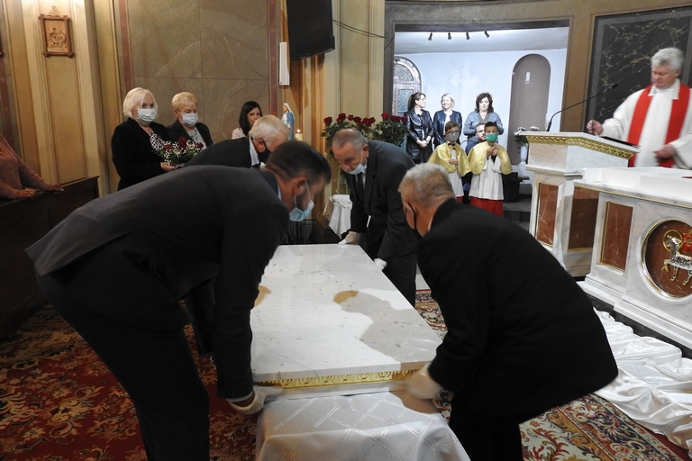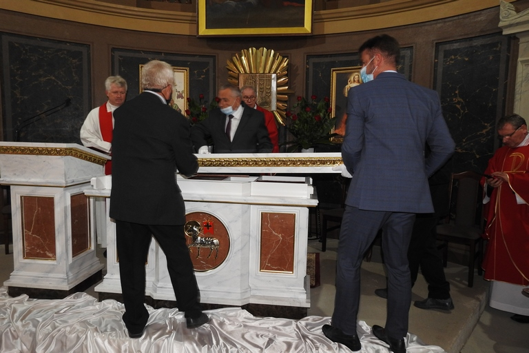 Pierwszym etapem uroczystości w czwartek 1 października 2020 r., było odczytanie pamiątkowego tekstu – kapsuły czasu, – która została umieszczona w ołtarzu, potem uroczyście zostały złożone relikwie Świętych Męczenników z Abiteny – Maksymiana i Wiktoriana. Następnie grupa zasłużonych dla parafii mężczyzn, nałożyła mensę ołtarzową. Gdyby nie maseczki na twarzach, na wielu obliczach widniałby uśmiech zadowolenia, że pierwszy etap naszego zadania pod nazwą «OŁTARZE» dobiegł szczęśliwie do końca. Przed nami drugi etap, znacznie trudniejszy i kosztowniejszy. Rekonstrukcja głównego ołtarza z naszego kościoła, który zaginął po II wojnie światowej.