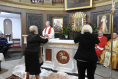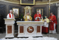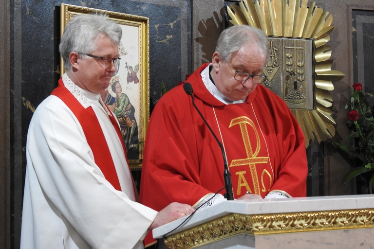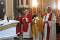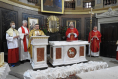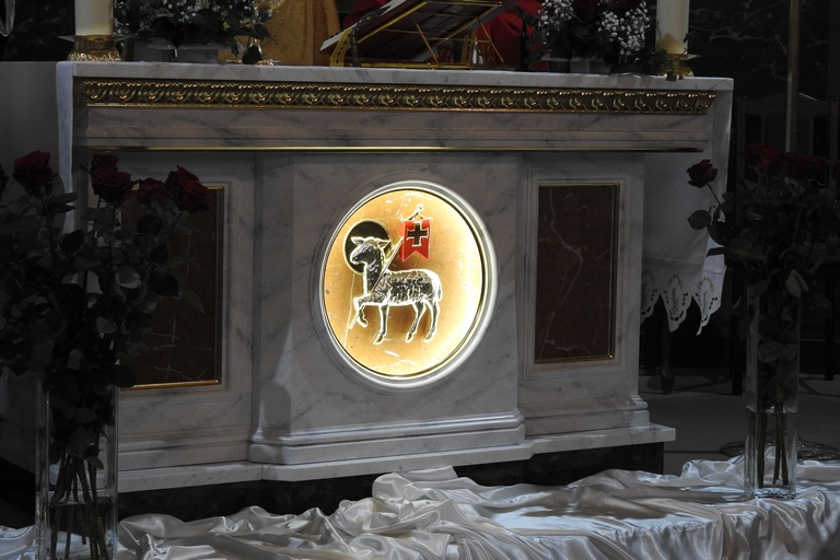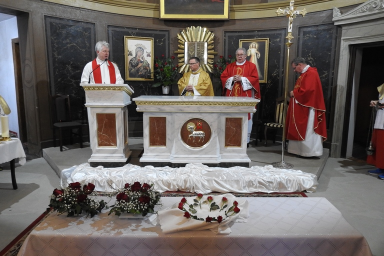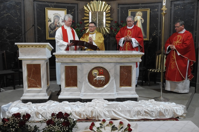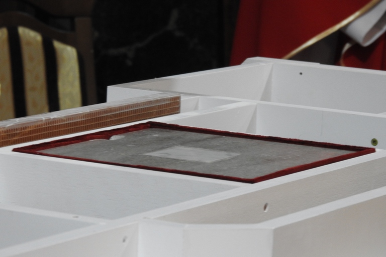 POWTARZAJĄC DUCHOWĄ WIZJĘ JANA APOSTOŁA W APOKALIPSIE: «UJRZAŁEM POD OŁTARZEM DUSZE ZABITYCH DLA SŁOWA BOŻEGO I DLA ŚWIADECTWA, JAKIE MIELI» UMIESZCZAMY W OŁTARZU RELIKWIE ŚWIĘTYCH MĘCZENNIKÓW MAKSYMIANA I WIKTORIANA KTÓRYCH AUTENTYCZNOŚĆ POTWIERDZIŁ SWYM PODPISEM BISKUP FRANCISZEK JEDWABSKI.