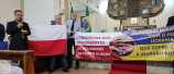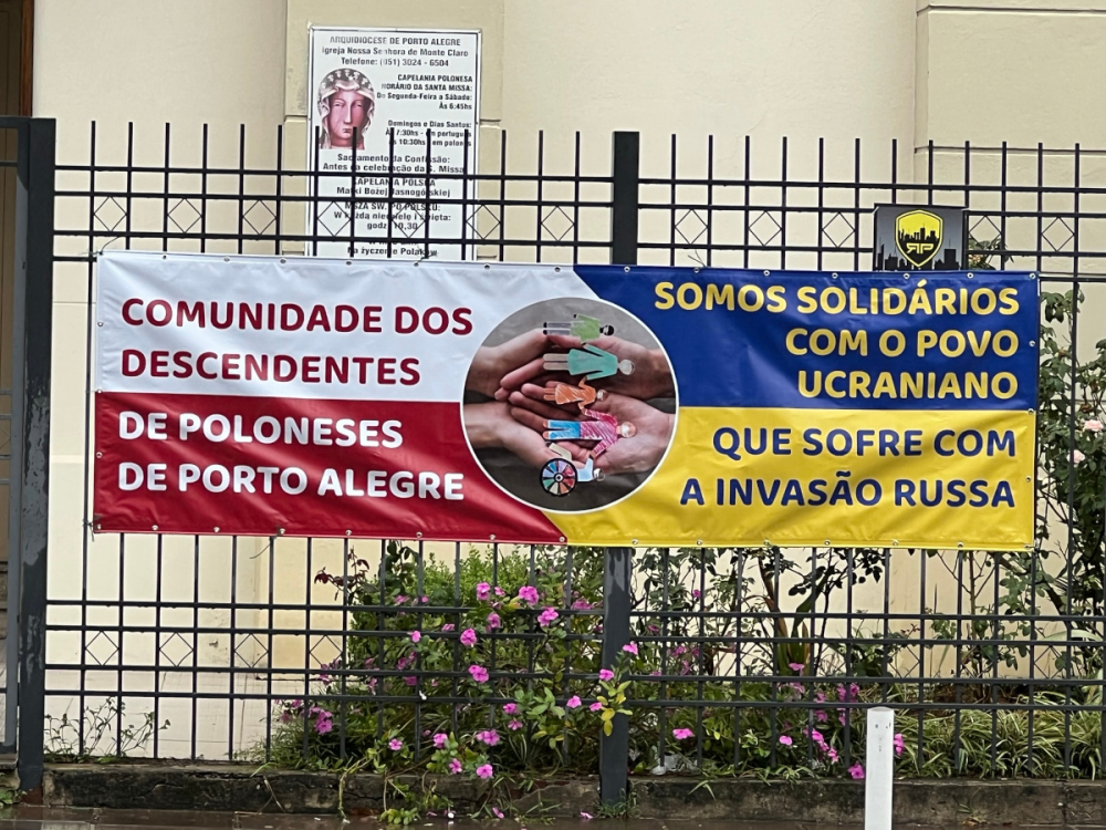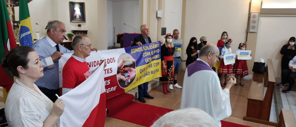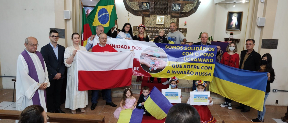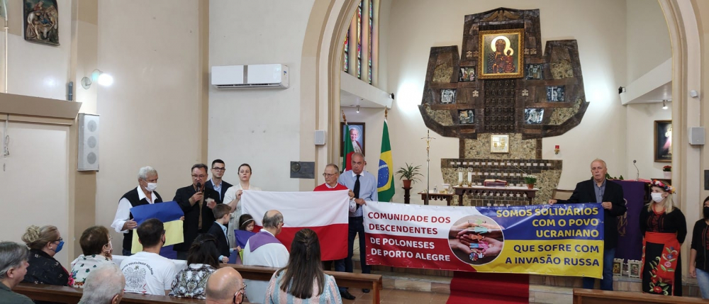 Ze względu na padający deszcz manifestacja, która miała się odbyć na ulicy przed polskim kościołem, została przeniesiona do świątyni. Na wspólne solidarnościowe spotkanie zaprosiliśmy przedstawicieli społeczności ukraińskiej ze stolicy wspomnianego powyżej stanu oraz miasta Canoas należącego do regionu metropolitalnego Porto Alegre. Nasza wspólnota polonijna została uhonorowana obecnością ks. Krzysztofa Olejnika SChr przełożonego generalnego Towarzystwa Chrystusowego przeprowadzającego w tym czasie wizytację kanoniczną w prowincji zgromadzenia w Ameryce Południowej. (W tym miejscu trzeba wyrazić wdzięczność wobec Księdza Generała, że przesunął wizytację w Quedas do Iguaçu, w Paranie, aby przylecieć do Porto Alegre, gdyż jeszcze nie znał tej Kapelanii Polskiej. Natomiast w Quedas już był kilka lat wstecz). W sobotę 12 marca do Porto Alegre przyleciał ponadto ks. prof. Mirosław Kalinowski rektor KUL. Przybył do tego miasta w celu nawiązania oficjalnych stosunków z Papieskim Uniwersytetem Katolickim oraz spotkać się z przedstawicielami władz stanu. Włączył się zatem do naszej wspólnej Mszy Świętej w intencji narodu ukraińskiego!