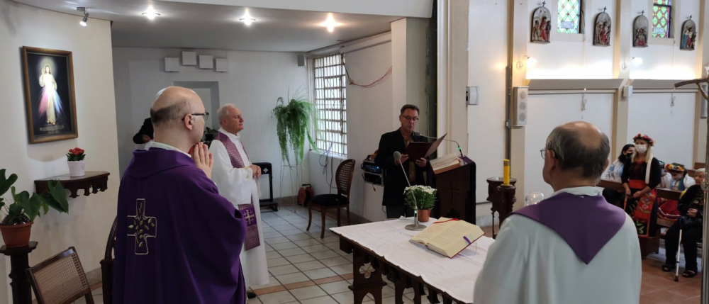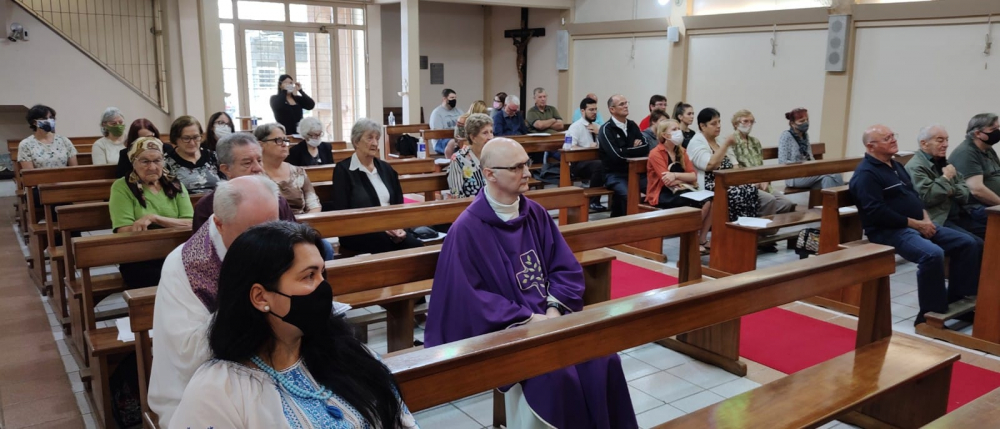 Msza Święta była sprawowana w języku polskim włącznie ze wszystkimi śpiewami części stałych, jak też i pieśni wielkopostnych. Liturgia Słowa, podobnie jak modlitwa wiernych były dwujęzyczne: po polsku i po portugalsku. Przed zakończeniem liturgii ks. Zdzisław podziękował ks. Krzysztofowi Olejnikowi za przybycie do Porto Alegre, aby zapoznać się z pracą chrystusowca wśród tutejszej Polonii i wraz z tą wspólnotą wspólnie się modlić za naród ukraiński! Podziękował także za „dłuższe nocne rozmowy rodaków” w eremie duszpasterza, mającego do dyspozycji małe mieszkanie nad zakrystią polskiego kościoła. Podziękował również ks. Rektorowi Mirosławowi Kalinowskiemu za pragnienie poznania polskiego kościoła oraz wspólnie odprawioną Mszę Świętą. Ponadto życzył, aby podpisanie umowy pomiędzy Papieskim Uniwersytetem Katolickim w Porto Alegre i Katolickim Uniwersytetem Lubelskim Jana Pawła II (które nastąpiło nazajutrz 14 marca) przyniosło oczekiwane owoce w postaci powołania do działalności Katedry Polskiej, gdzie młodzi Polonusi i Brazylijczycy będą mogli poznawać literaturę, kulturę i język polski. Przy okazji przypomniał przygotowania i rozmowy, jakie były prowadzone w rektoracie PUC-RS z okazji organizacji uroczystych obchodów stulecia odzyskania niepodległości przez Polskę, gdy wraz z konsulem Sechinskim poruszano kwestię powołania do istnienia Katedry Polskiej na uczelni. W prowadzeniu tych rozmów, kontynuował duszpasterz, przeszkodziła epidemia COVID-19. Dopiero oficjalna wizyta w Porto Alegre p. Jakuba Skiby, Ambasadora RP w Brazylii, która odbyła się w listopadzie 2021 r., i spotkanie przy tej okazji z rektorem PUC-RS zaczęła przynosić oczekiwane owoce. Szczególne słowo podziękowania ks. Zdzisław skierował do przybyłych przedstawicieli społeczności ukraińskiej: za przyjęcie zaproszenia i uczestnictwo w tym akcie solidarnościowym z Ukrainą, jaką była wspólna modlitwa za kraj ich pochodzenia. Następnie przemówił przedstawiciel tejże społeczności ukraińskiej i podziękował za przejawy naszej współpracy i troski o wolną, niepodległą Ukrainę. Wspomniał też, że kiedy przyjechał jako dorastający chłopiec ze swoim ojcem, to pierwszą świątynią, którą poznał w Porto Alegre, był właśnie polski kościół, Tam też z nim przychodził na niedzielne Msze Święte. Po słowie Przełożonego Generalnego, który wyraził wdzięczność wszystkim przybyłym na wspólną modlitwie, i błogosławieństwie kończącym liturgię, odśpiewaliśmy polskie suplikacje wypraszając u Boga dar pokoju dla uciemiężonej przez Rosję bohatersko broniącej się Ukrainy.