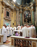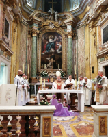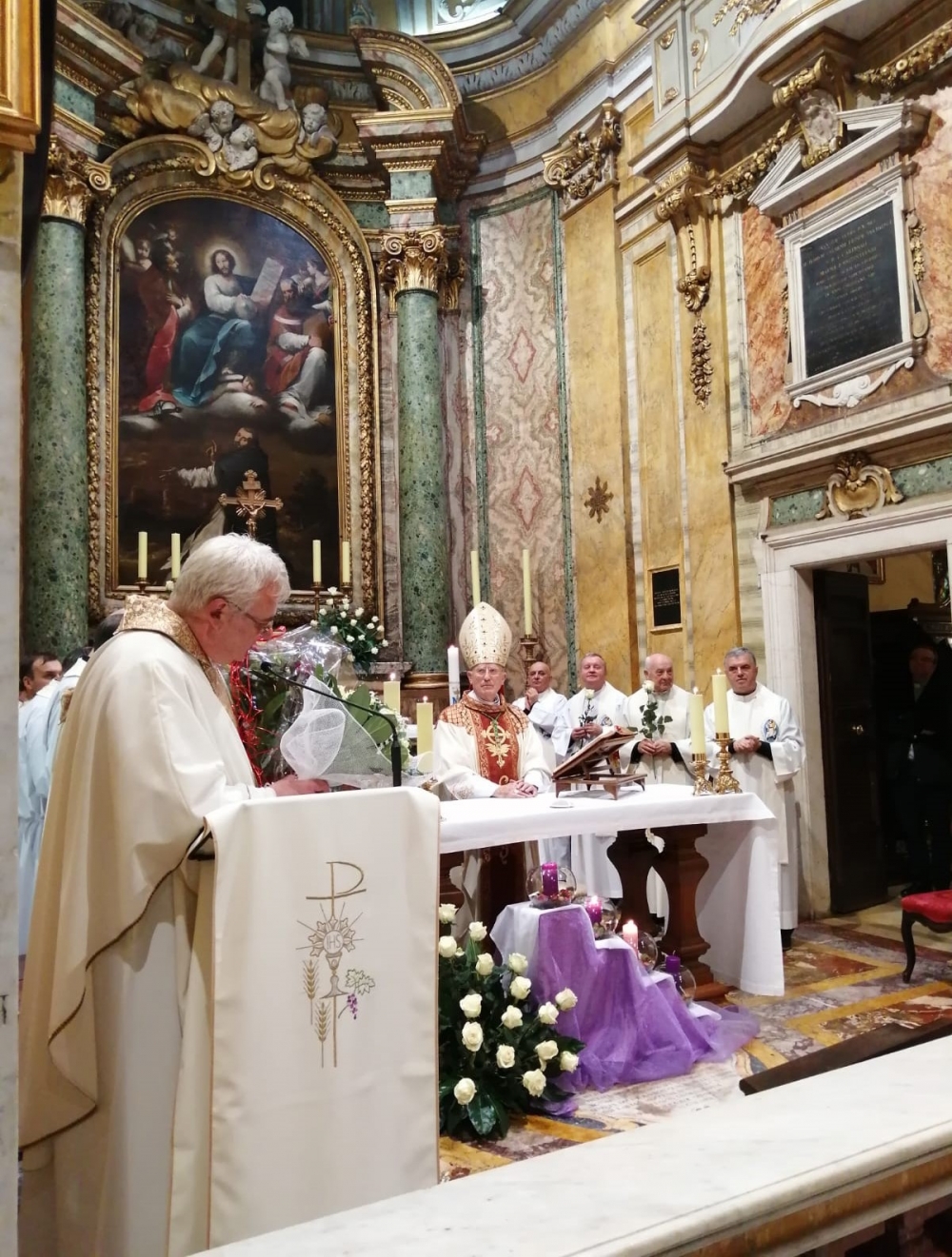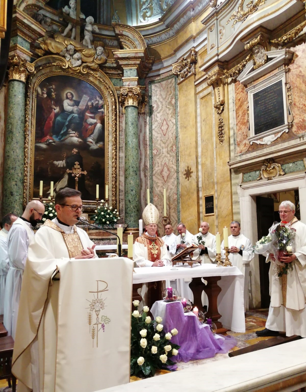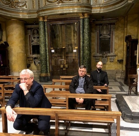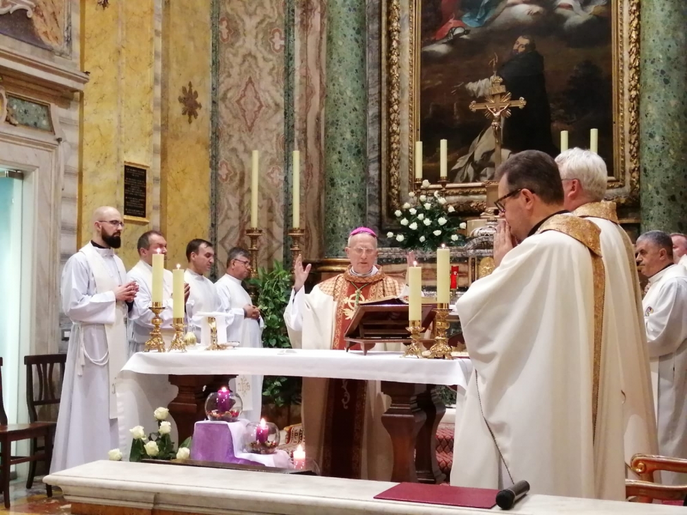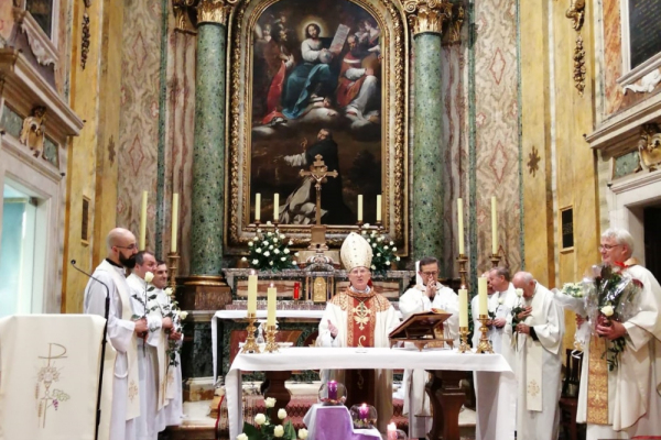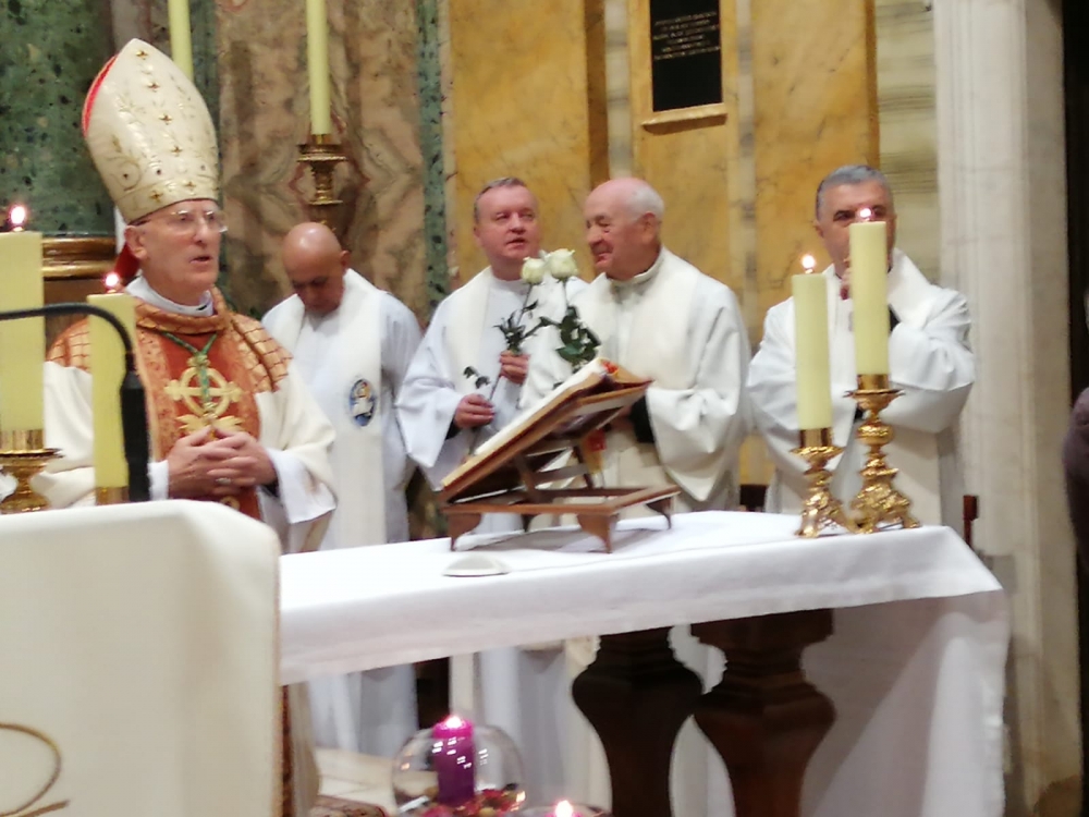 W  2019 roku przypada także 60 lat od chwili, kiedy duszpasterstwo Polaków na terenie całych Włoch powierzono po raz pierwszy chrystusowcowi, a był nim ks. Mieczysław Kowalczyk SChr (wcześniej tę funkcję pełnili: ks. Władysław Rubin oraz ks. Szczepan Wesoły). Obie te rocznice są godne tego, aby je zauważyć, docenić i uczcić… Dlatego też adwentowy dzień skupienia dla chrystusowców pracujących w Italii, przybrał formą szczególnie uroczystą. Przybyli na niego 16 grudnia 2019 roku z Niemiec: prowincjał ks. Bogdan Renusz SChr, wiceprowincjał ks. Sebastian Sosnowski SChr oraz ks. Marcin Dereszkiewicz SChr (wszyscy trzej związani w przeszłości z tym kościołem). Na wstępie uczestnicy odmówili koronkę do Bożego Miłosierdzia i wysłuchali konferencji ascetycznej, którą wygłosił ks. Sebastian. Następnie miała miejsce adoracja eucharystyczna oraz nieszpory. O godz. 18.30 rozpoczęła się uroczysta Eucharystia pod przewodnictwem ks. abp. Edwarda Nowaka, który wygłosił homilię. Po zakończonej liturgii, licznie zgromadzeni jej uczestnicy udali się do Auli Jana Pawła II, gdzie nestor chrystusowców pracujących na włoskiej ziemi, ks. Marian Burniak SChr, z właściwą sobie swadą i poczuciem humoru, wygłosił referat historyczny.