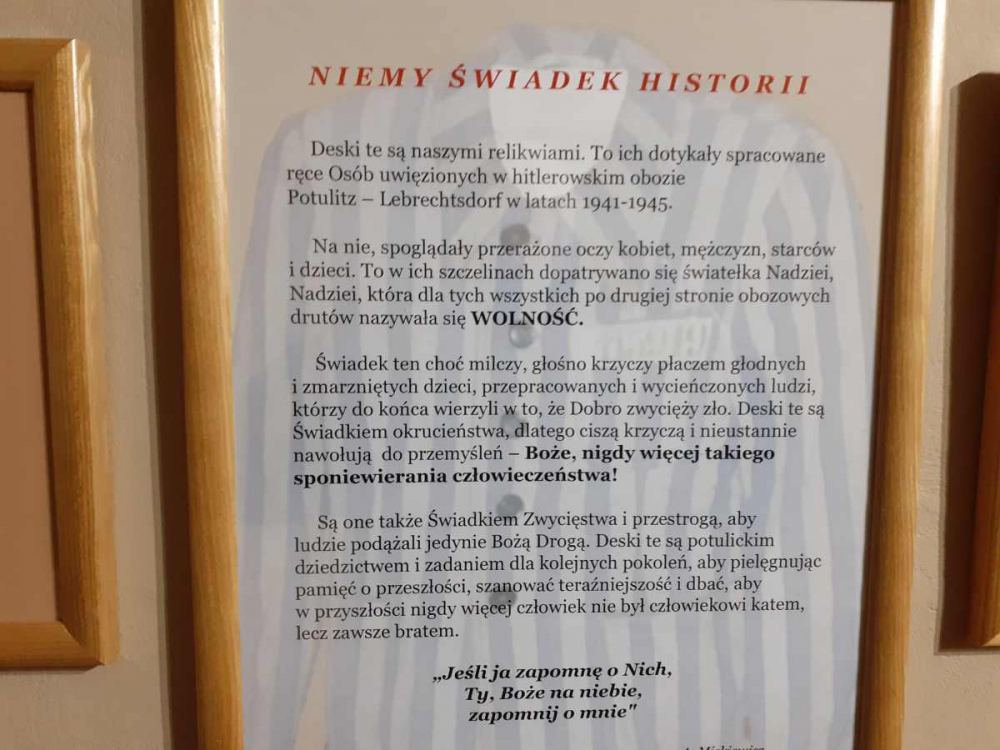 W piątek 12 listopada 2021 r. późnym wieczorem, a można powiedzieć że już nocą, skończyły się prace restauratorskie w tzw. „chórku”. Zakończenie tego etapu prac zasługuje na szczególną uwagę, albowiem w tym tzw. „chórku” umieszczono trzy deski, które są „Niemymi Świadkami Historii”. Nie wiemy dokładnie do czego służyły, jednak umieszczony na nich napis „Lebrechtsdorf” świadczy o tym, że były jakimś elementem hitlerowskiego obozu w Potulicach z okresu II Wojny Światowej. Po każdej Mszy Świętej w niedzielę 14 listopada wielu wiernych podchodziło w to szczególne miejsce, aby z bliska obejrzeć i nawet dotknąć tych „niezwykłych”-zwykłych desek.