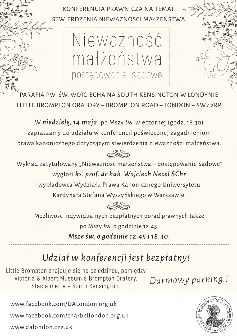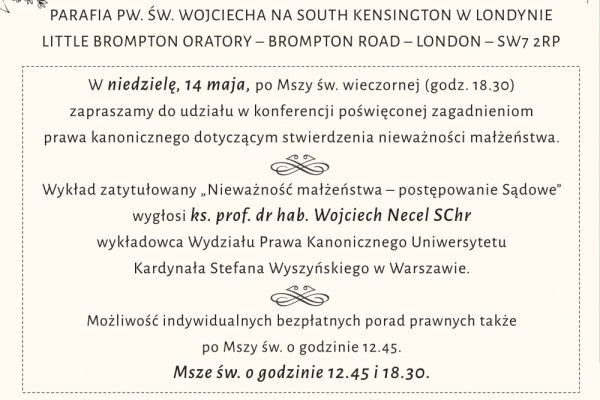 Parafia pw. św. Wojciecha na South Kensington w Londynie zaprasza na konferencję poświęconą zagadnieniom prawa kanonicznego dotyczącym stwierdzenia nieważności małżeństwa.