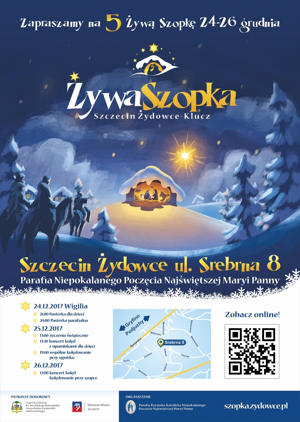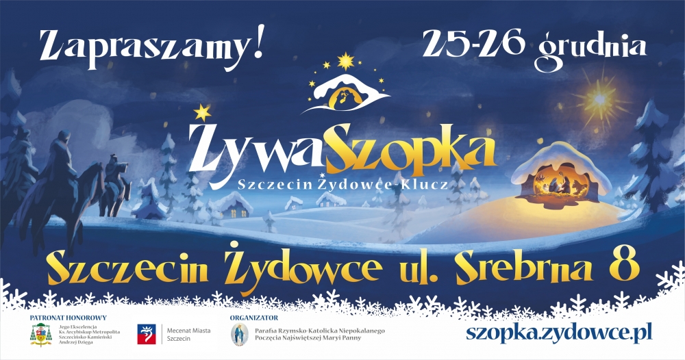 Proboszcz parafii pw. Niepokalanego Poczęcia NMP w Szczecinie-Żydowcach zaprasza do nawiedzenia Żywej Szopki, organizowanej już po raz piąty. Szczegóły znajdują się na plakacie.
