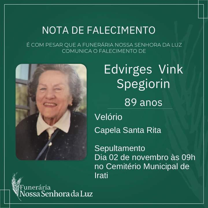 Pokładając ufność w Jezusie Chrystusie, który jest zmartwychwstaniem i życiem, informujemy, że w wieku 89 lat do wieczności odeszła śp. Edvirges Vink Spegiorin, mama ks. Andersona, wiceprowincjała prowincji południowoamerykańskiej.